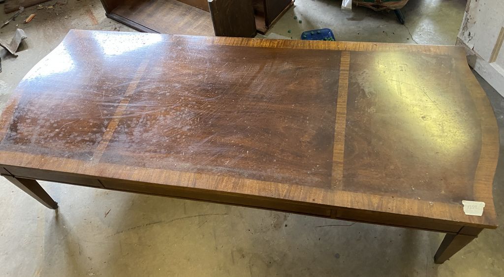 French Provincial Mahogany Coffee Table, finish is worn, 16"h., 60"w, Location Garage French Provincial Mahogany Coffee Table, finish is worn, 16"h., 60"w, Location Garage
