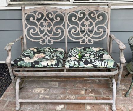 Ornate Aluminum Outdoor Platform Bench, lightly weathered. Ornate Aluminum Outdoor Platform Bench, lightly weathered.