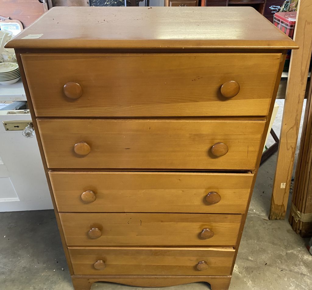 Late 20th Century Maple Chest of Drawers, tradition style, needs cleaning, five drawer, light wear, 44"h., 29"w. Location Garage Late 20th Century Maple Chest of Drawers, tradition style, needs cleaning, five drawer, light wear, 44"h., 29"w. Location Garage