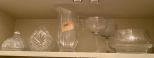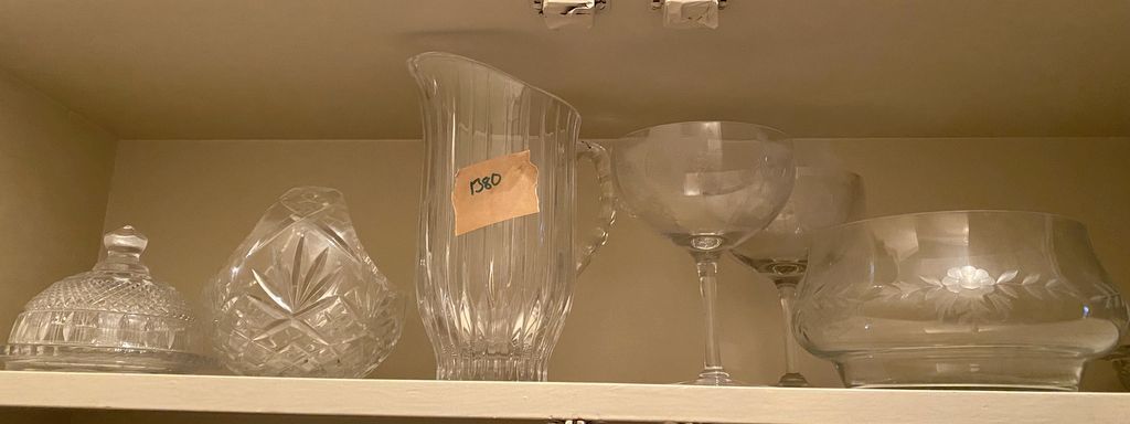 Group of Etched and Pressed Glassware, cheese dome, wine glasses, bowl, pitcher, basket, Location Hall Cabinet Group of Etched and Pressed Glassware, cheese dome, wine glasses, bowl, pitcher, basket, Location Hall Cabinet