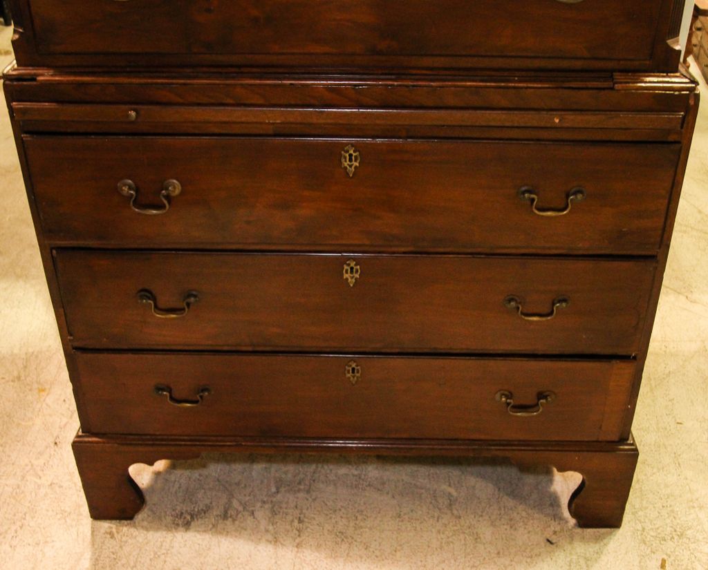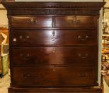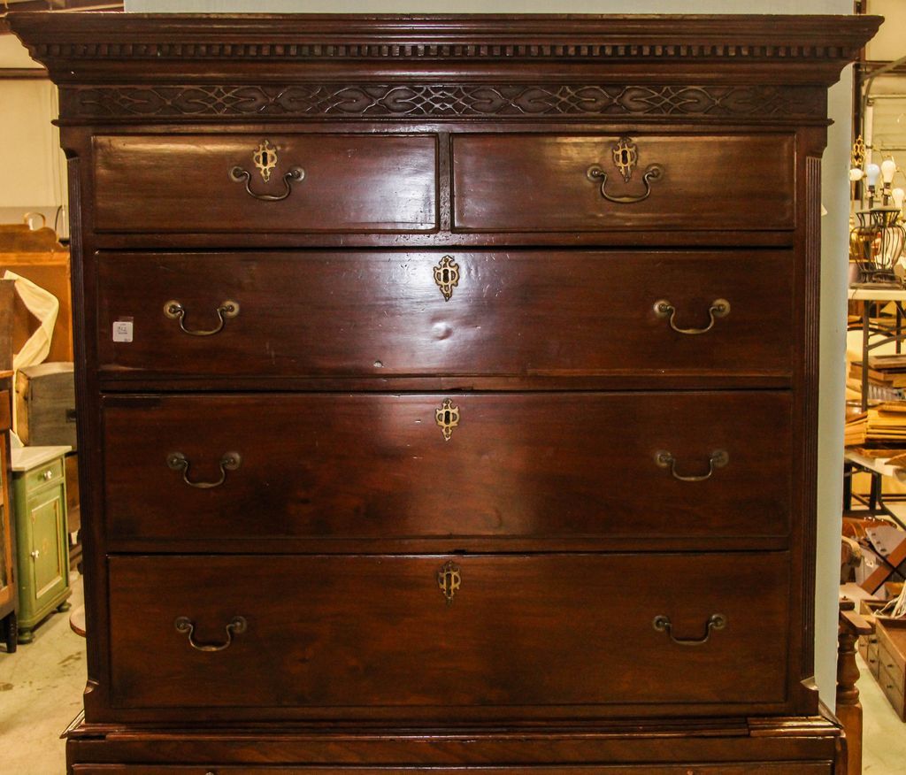 19th century mahogany Chippendale style chest on chest having a carved dentil moulding, dust drawer, supported by bracket feet. 3" wood molding missing about dust drawer also repairs in this section.; 42" w., 20" d., 73 1/2" h. 19th century mahogany Chippendale style chest on chest having a carved dentil moulding, dust drawer, supported by bracket feet. 3" wood molding missing about dust drawer also repairs in this section.; 42" w., 20" d., 73 1/2" h.