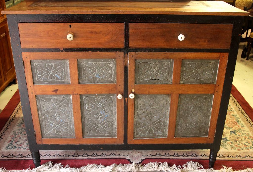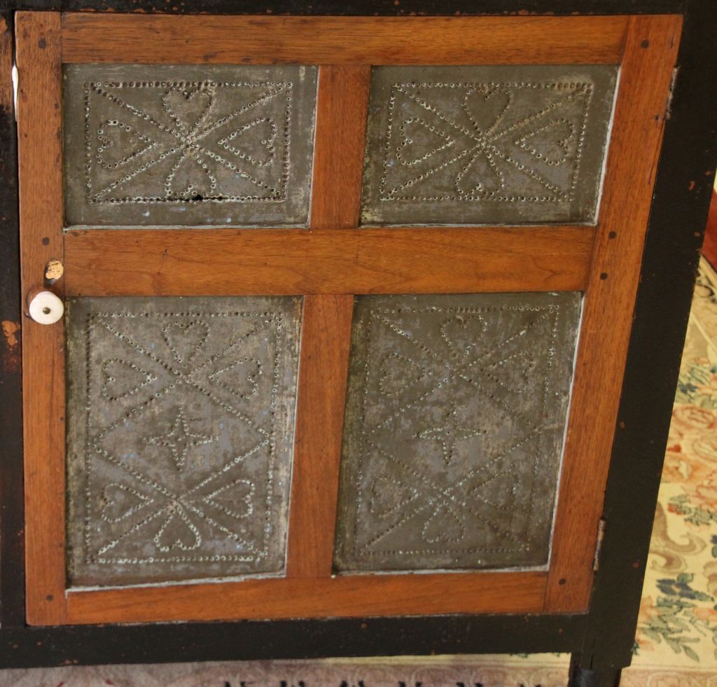 Double door punched tin pie safe.; 57" w., 18 1/2" d., 96" h. Double door punched tin pie safe.; 57" w., 18 1/2" d., 96" h.
