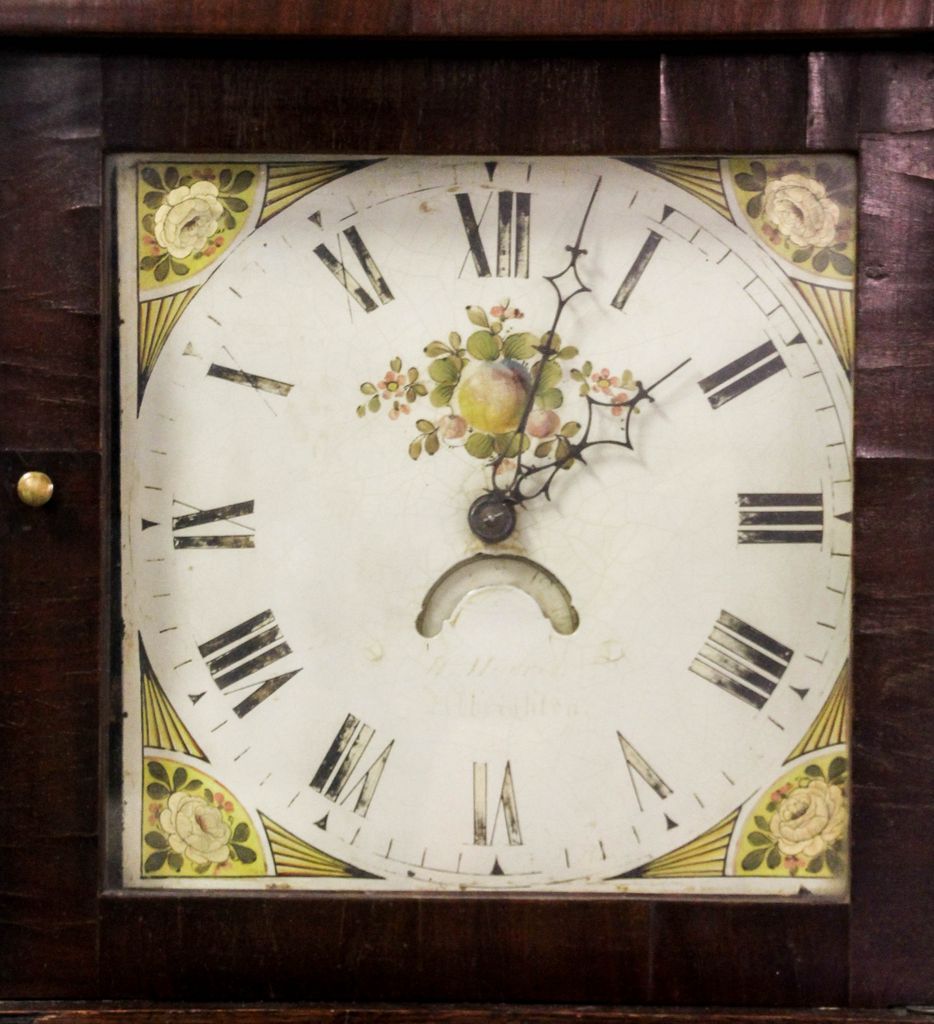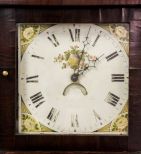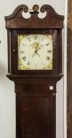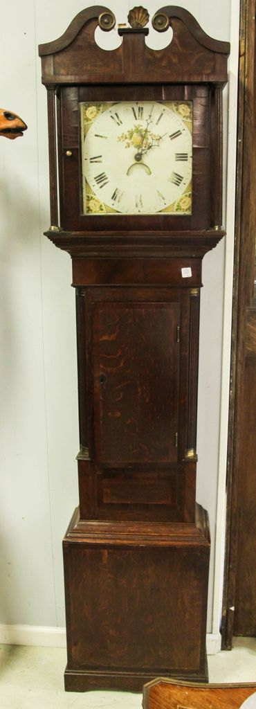 19th century oak grandfather clock, one weight is missing; 14 1/2" w., 9 1/2" d., 78" h. 19th century oak grandfather clock, one weight is missing; 14 1/2" w., 9 1/2" d., 78" h.