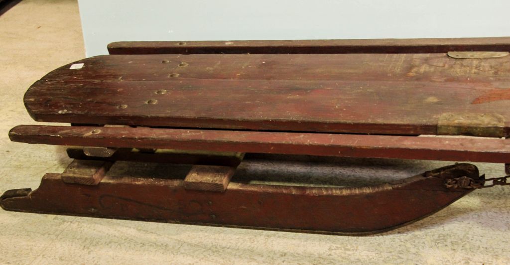 Antique painted red long sled; 83" l., 21" w. Antique painted red long sled; 83" l., 21" w.