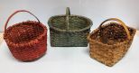 Three antique hickory baskets, one natural basket 13" w., 9" d., 12" h., one painted red 11" dia, 14" h. & one green 15" w., 12 1/2" d., 13" h. Three antique hickory baskets, one natural basket 13" w., 9" d., 12" h., one painted red 11" dia, 14" h. & one green 15" w., 12 1/2" d., 13" h.