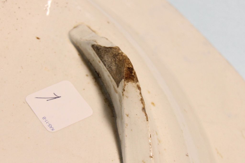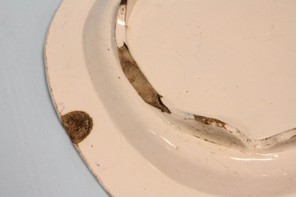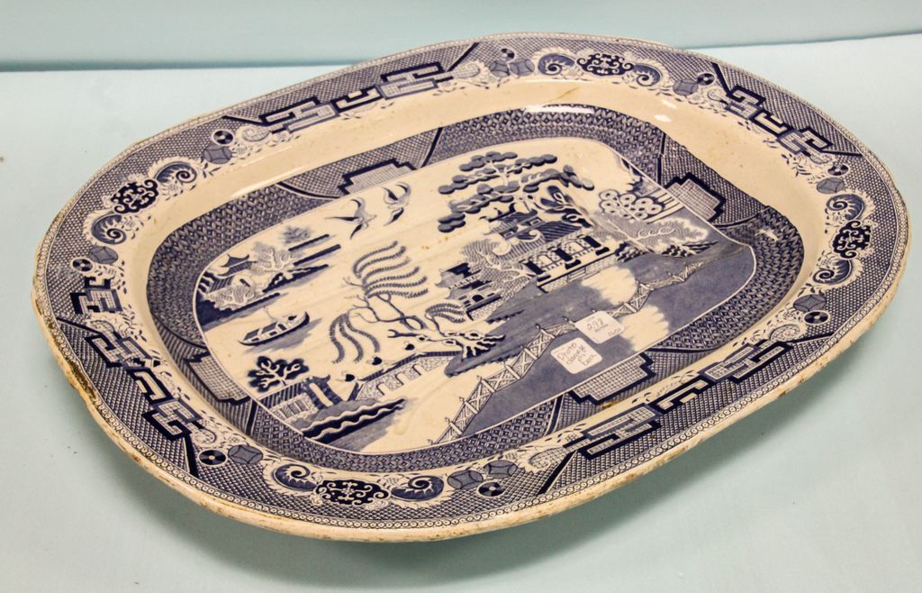 Extremely large Blue Willow meat platter. Great platter but has damage, hole on front side, three large chips on bottom and wears on all feet.; 23 1/2" w. Extremely large Blue Willow meat platter. Great platter but has damage, hole on front side, three large chips on bottom and wears on all feet.; 23 1/2" w.