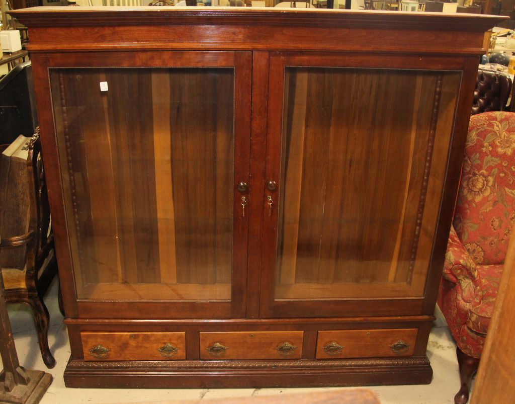 Double glass door bookcase with interior shelves, three drawers and egg and dart carved on bottom.; 63 1/2" w., 15" d., 63" h. Double glass door bookcase with interior shelves, three drawers and egg and dart carved on bottom.; 63 1/2" w., 15" d., 63" h.