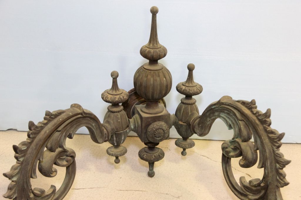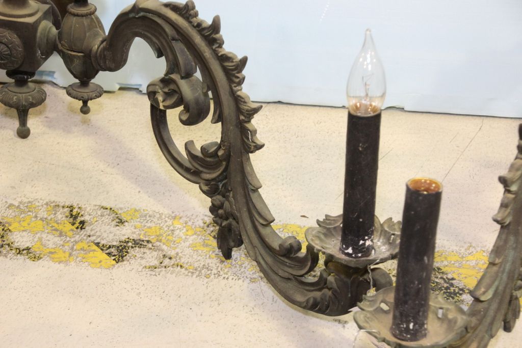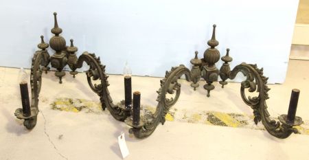 Pair of elaborate iron double arm wall sconces, arms swing and need wiring.; 21" d., 14 1/2" h., width varies Pair of elaborate iron double arm wall sconces, arms swing and need wiring.; 21" d., 14 1/2" h., width varies