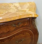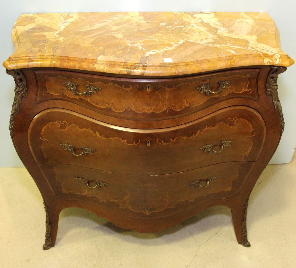 Marble top Bombay chest with brass mounts and three drawers which have scroll inlay.; 37" w., 22 1/2" d., 36" h. Marble top Bombay chest with brass mounts and three drawers which have scroll inlay.; 37" w., 22 1/2" d., 36" h.