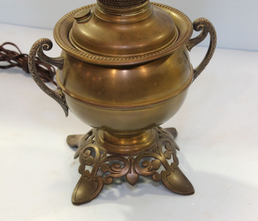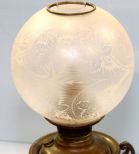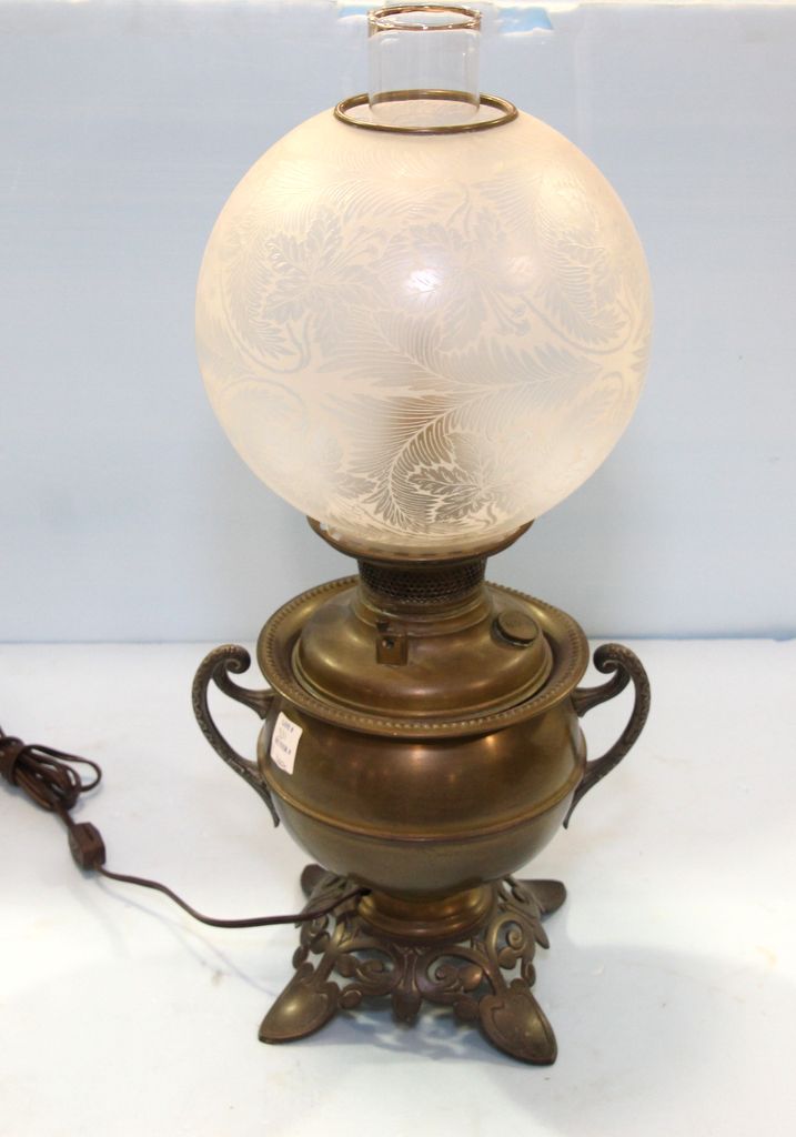 Late 19th century Bradley and Hubbard electrified kerosene lamp with etched hibiscus shade.; 22" h. Late 19th century Bradley and Hubbard electrified kerosene lamp with etched hibiscus shade.; 22" h.