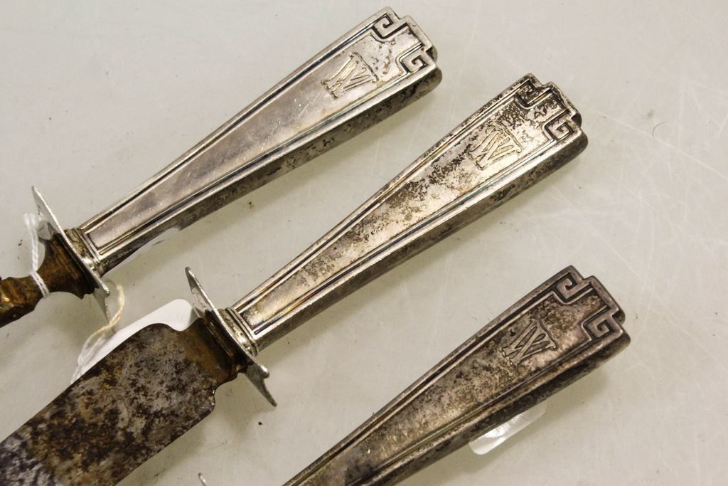 Three piece carving set with sterling handle, monogrammed with W. Pattern is Estruscan by Gorham Three piece carving set with sterling handle, monogrammed with W. Pattern is Estruscan by Gorham