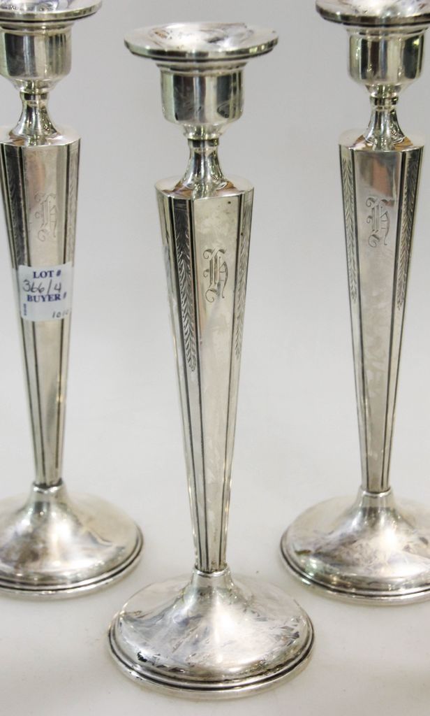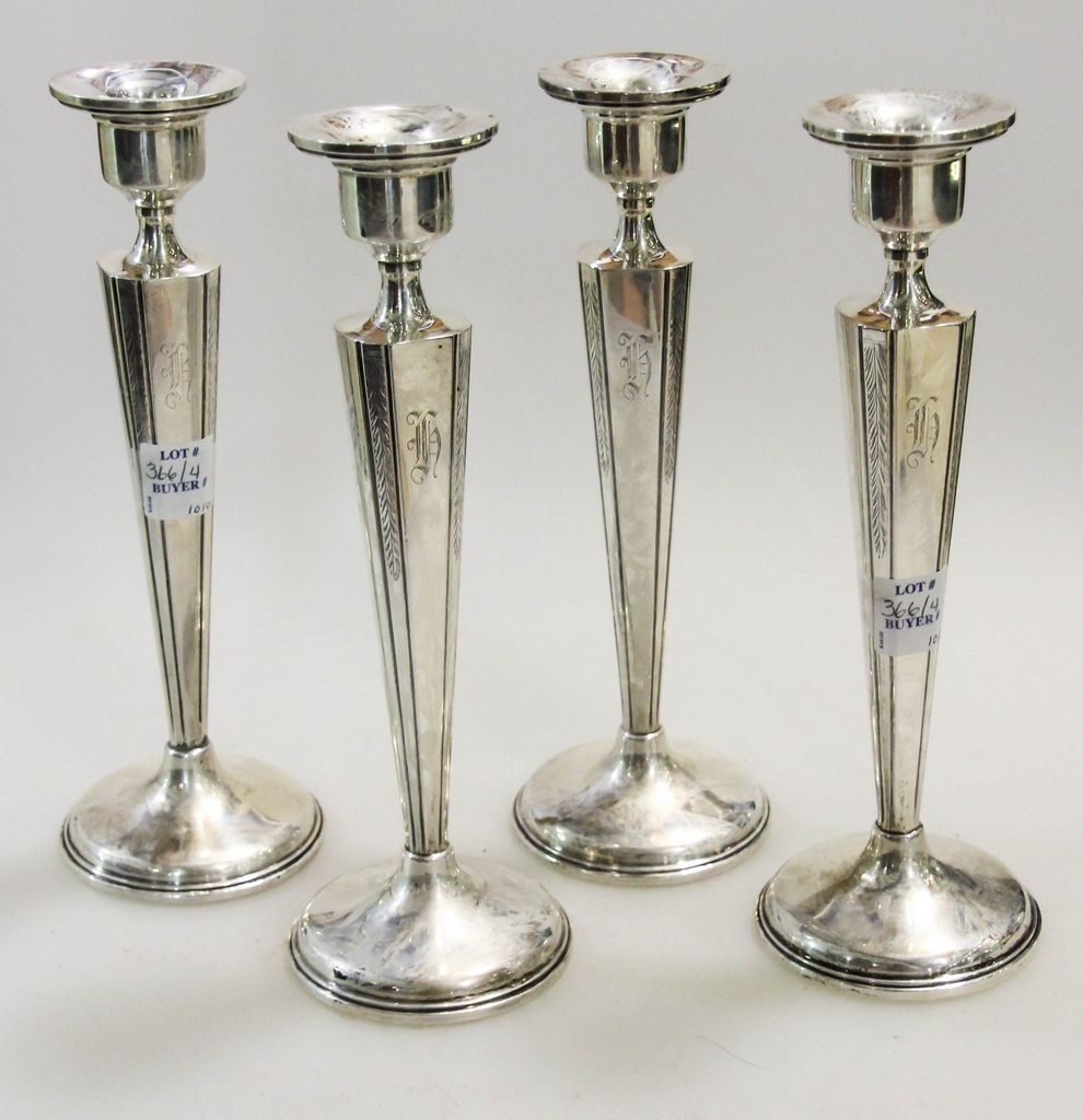 Set of four eight sided sterling silver candlesticks, each with etching design and monogrammed H.; 10" h. Set of four eight sided sterling silver candlesticks, each with etching design and monogrammed H.; 10" h.