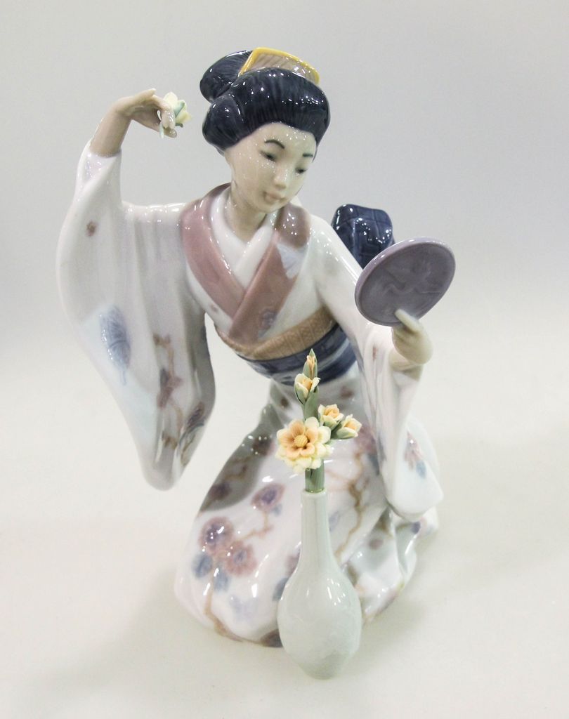 Lladro figurine of maiden holding mirror; 9 1/2" h. Lladro figurine of maiden holding mirror; 9 1/2" h.
