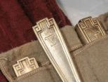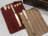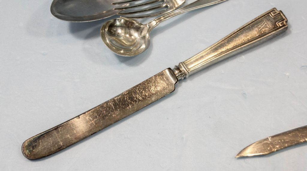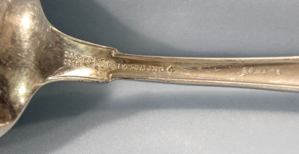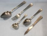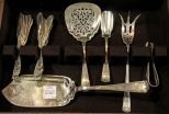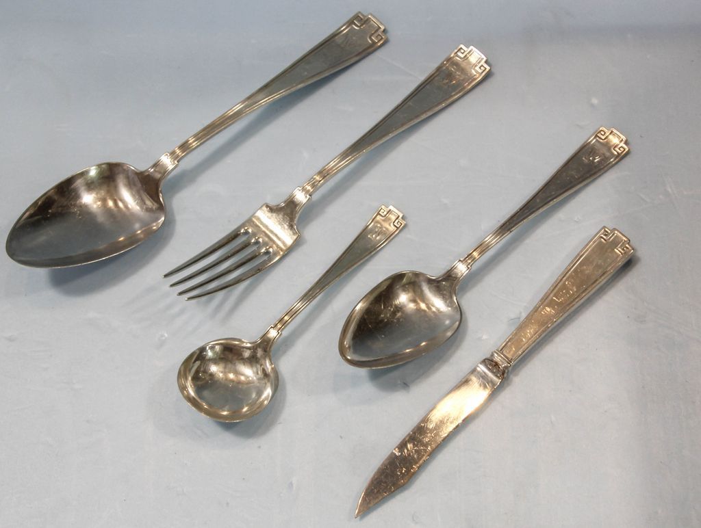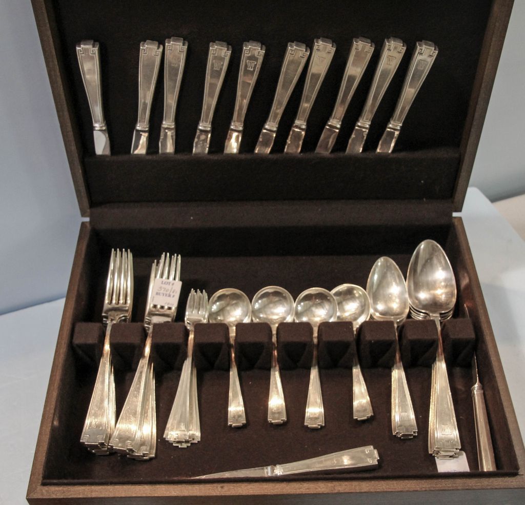 Estruscan by Gorham 1913 sterling flatware set consisting of 81 total pieces each with monogrammed W. Consists of twelve dinner forks, nine cocktail forks, twelve soup spoons, four tablespoons, five serving spoons, eleven steak knives, twelve butter knives, pie server, tongs, tomato server, sugar scoop, chipped beef fork & twelve large dinner knives Estruscan by Gorham 1913 sterling flatware set consisting of 81 total pieces each with monogrammed W. Consists of twelve dinner forks, nine cocktail forks, twelve soup spoons, four tablespoons, five serving spoons, eleven steak knives, twelve butter knives, pie server, tongs, tomato server, sugar scoop, chipped beef fork & twelve large dinner knives