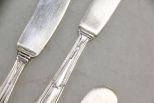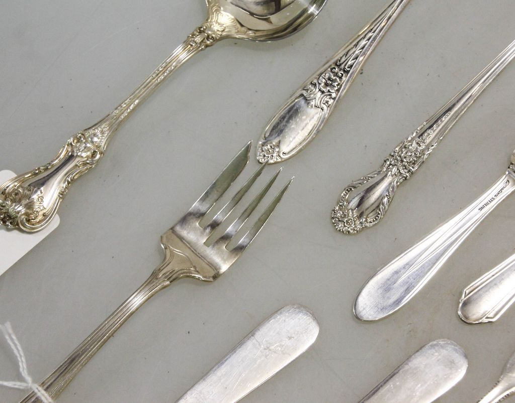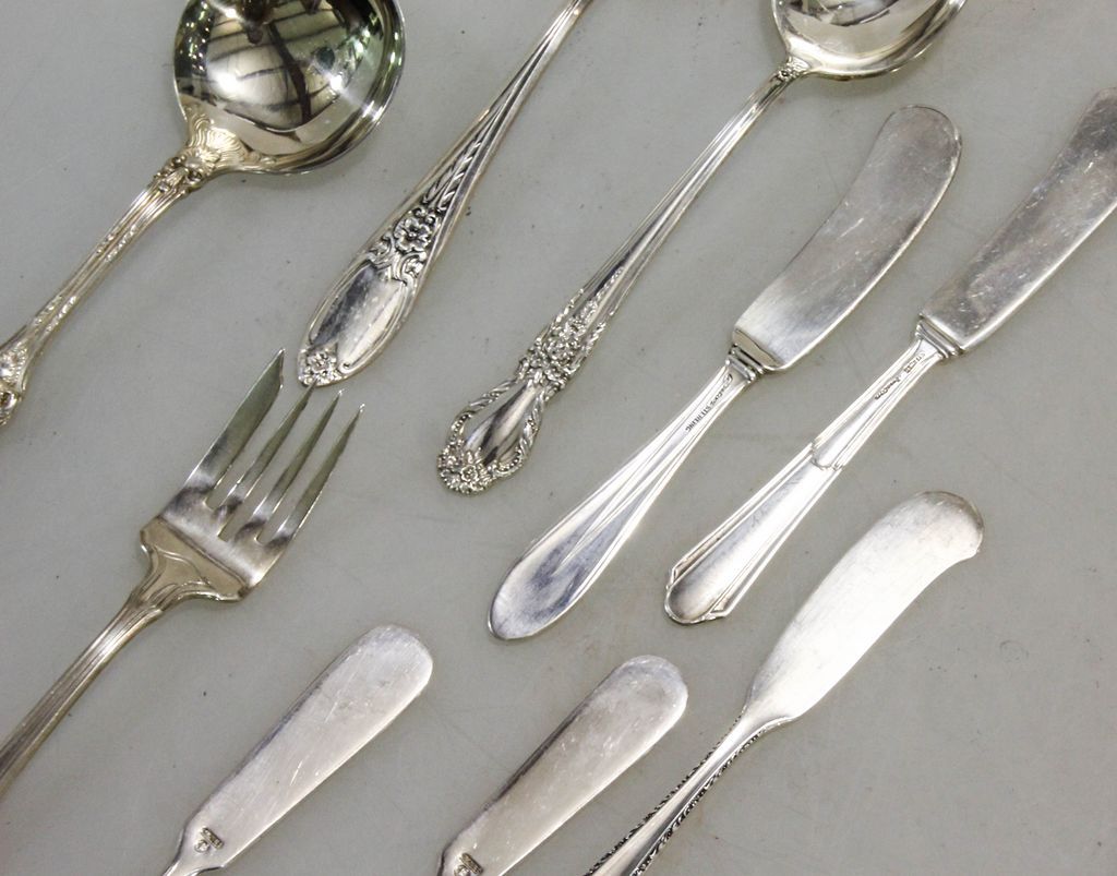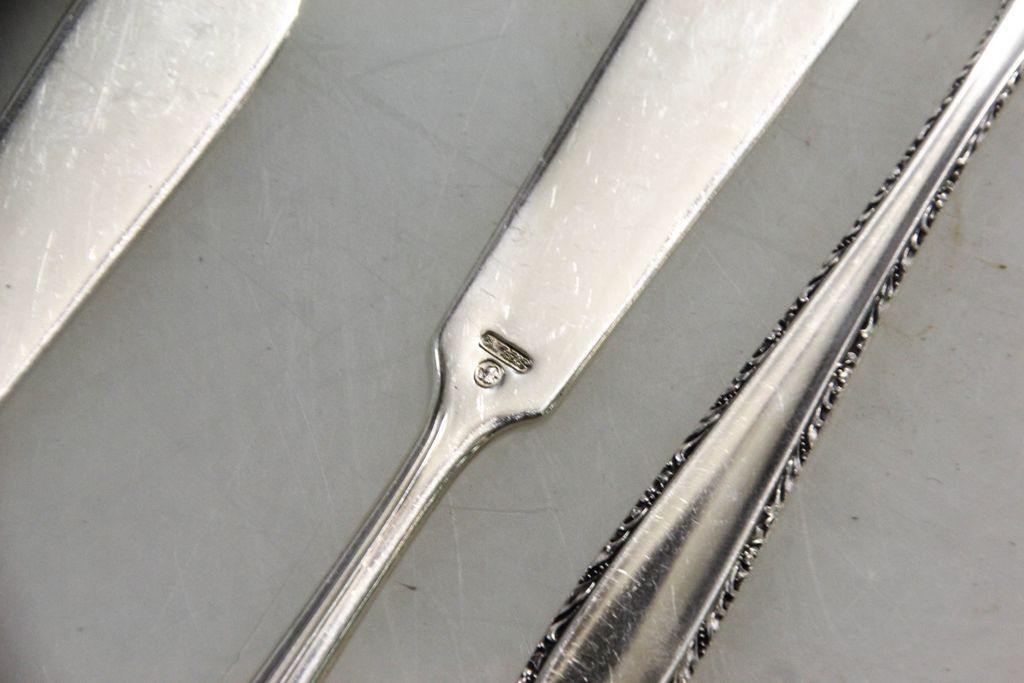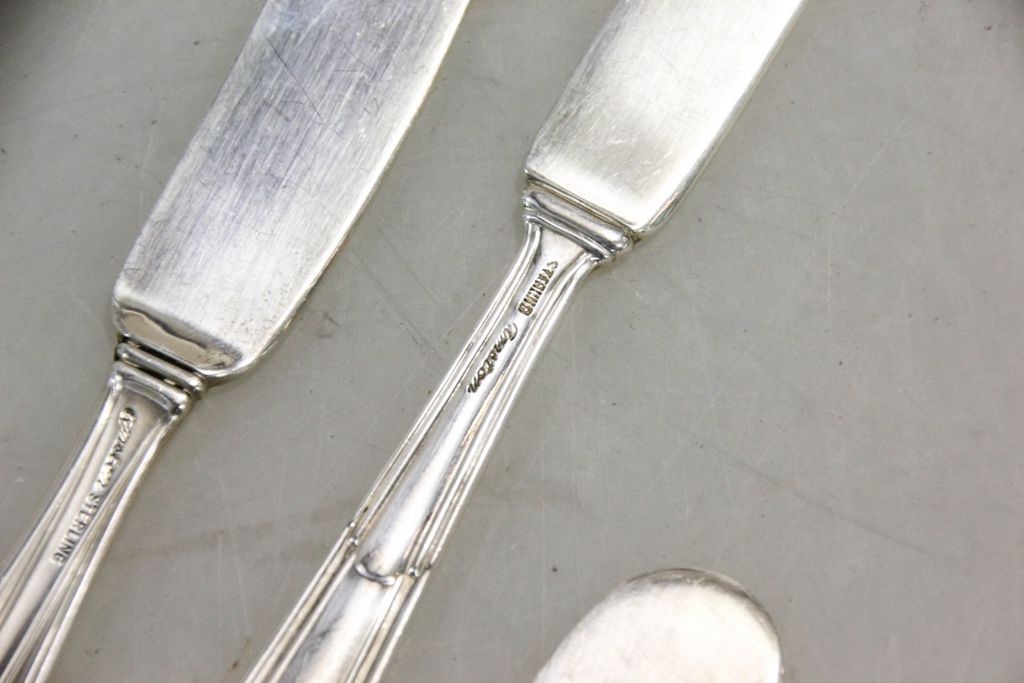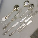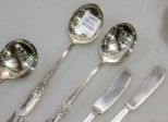 Small lot of sterling flatware consisting of five various pattern butter knives, salad fork, three soup spoons. Nine total pieces. Small lot of sterling flatware consisting of five various pattern butter knives, salad fork, three soup spoons. Nine total pieces.