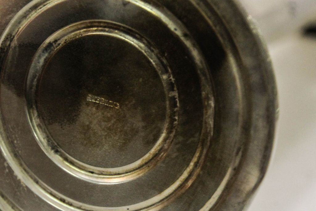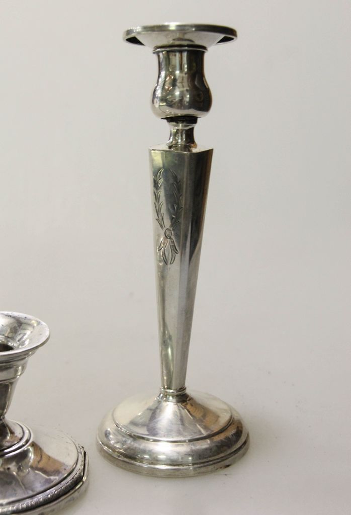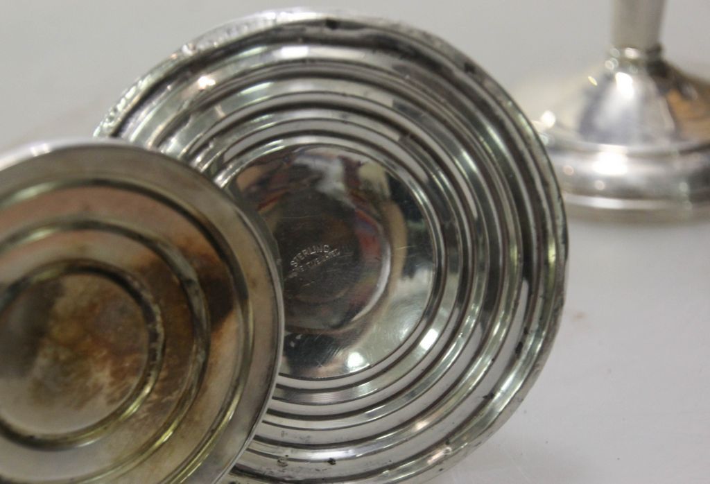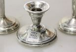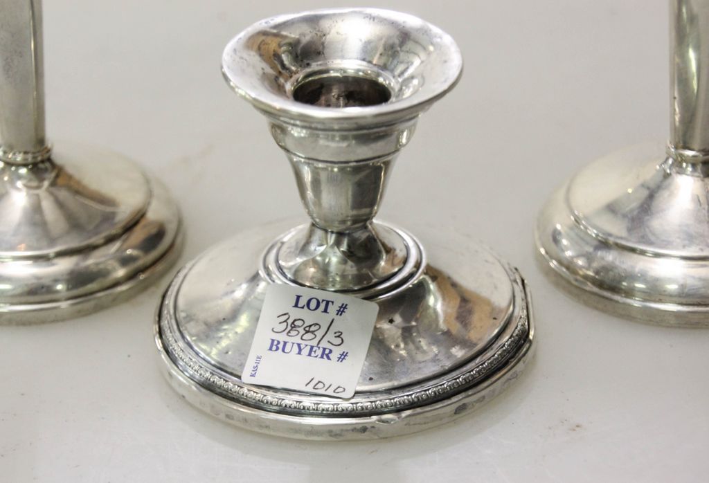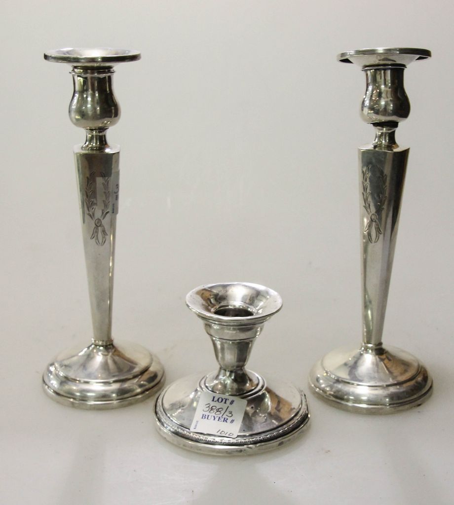 Three sterling candlesticks, one marked weighted. Pair- 7 3/4" h. One- 3" h. Three sterling candlesticks, one marked weighted. Pair- 7 3/4" h. One- 3" h.
