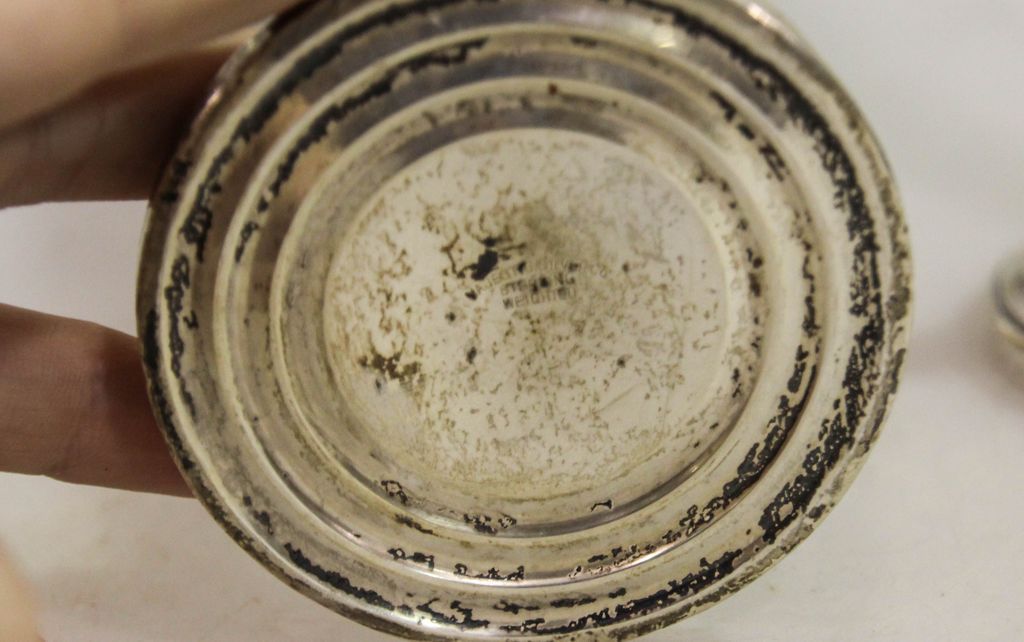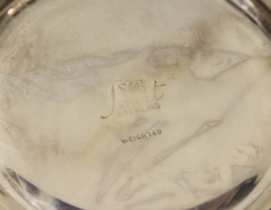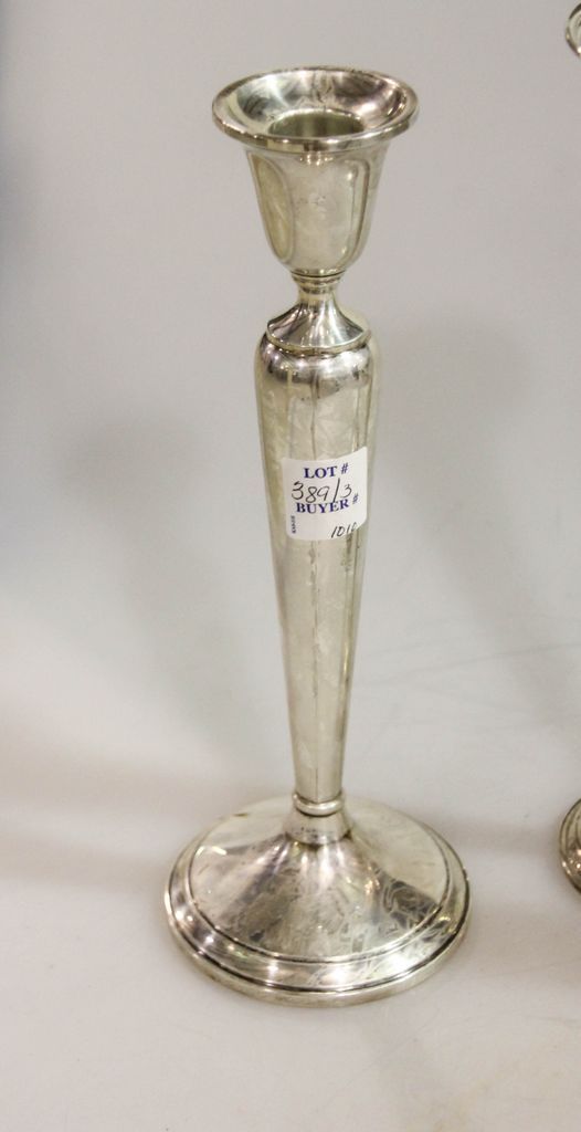 Pair of Launt sterling silver weighted 10" candlesticks and a Majestic sterling weighted 10 1/2" vase with dent on side Pair of Launt sterling silver weighted 10" candlesticks and a Majestic sterling weighted 10 1/2" vase with dent on side