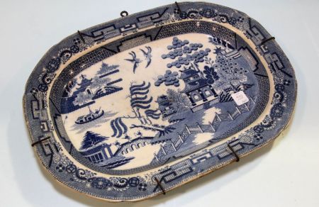 Large antique blue willow platter, 19" w. Large antique blue willow platter, 19" w.