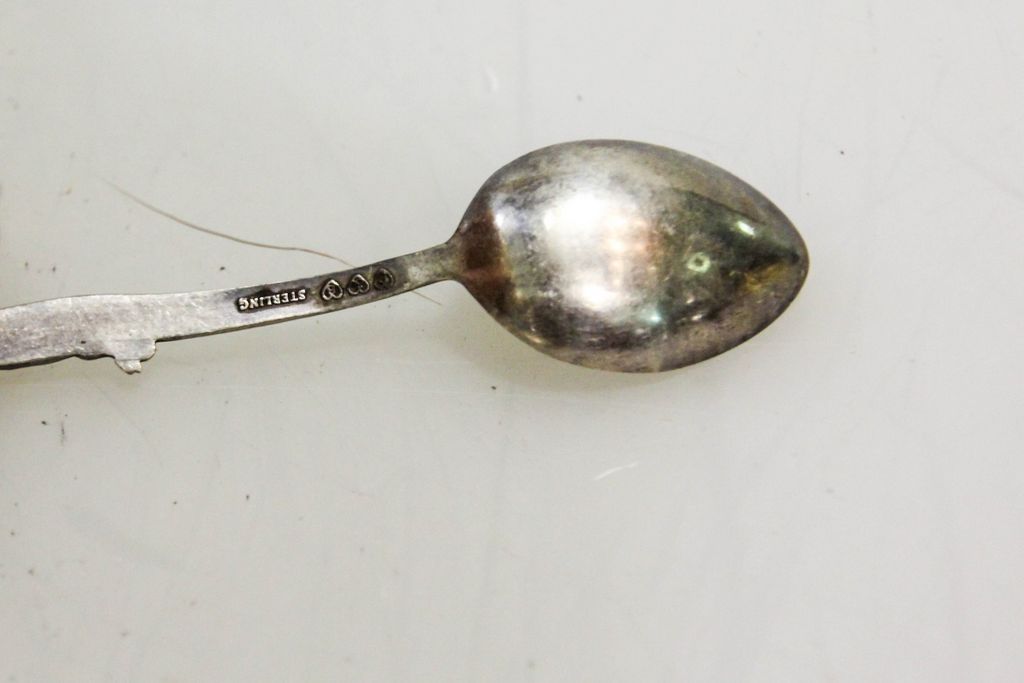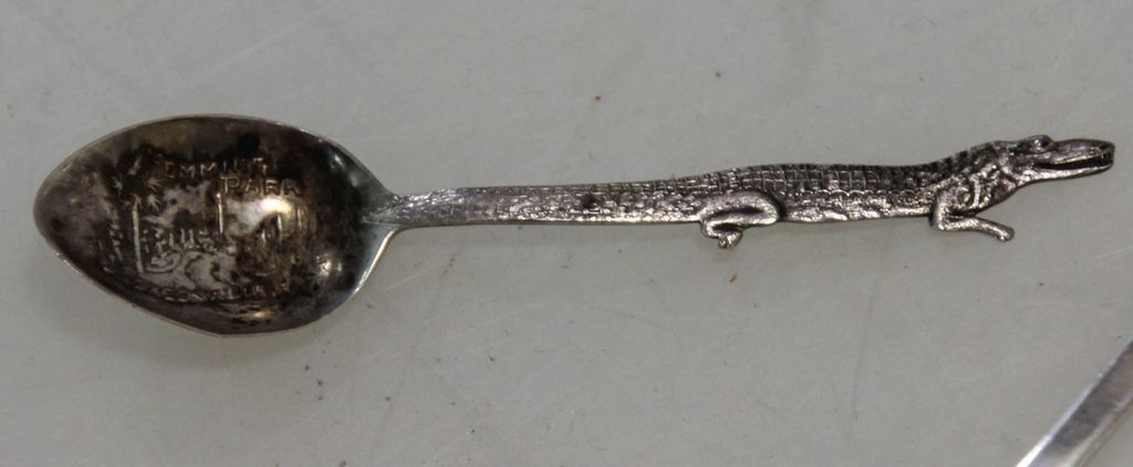 Small 3 1/2" sterling spoon with alligator on handle marked Henning Park, Jacksonville, FL, two various sterling spoons & coin silver spoon marked R.H. Bailey Woodstock Vermont 1837-1874 Small 3 1/2" sterling spoon with alligator on handle marked Henning Park, Jacksonville, FL, two various sterling spoons & coin silver spoon marked R.H. Bailey Woodstock Vermont 1837-1874
