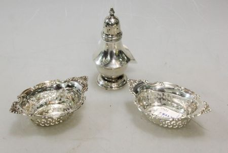 Two Gorham sterling silver nut dishes and sterling shaker Two Gorham sterling silver nut dishes and sterling shaker