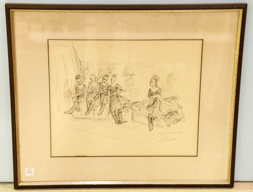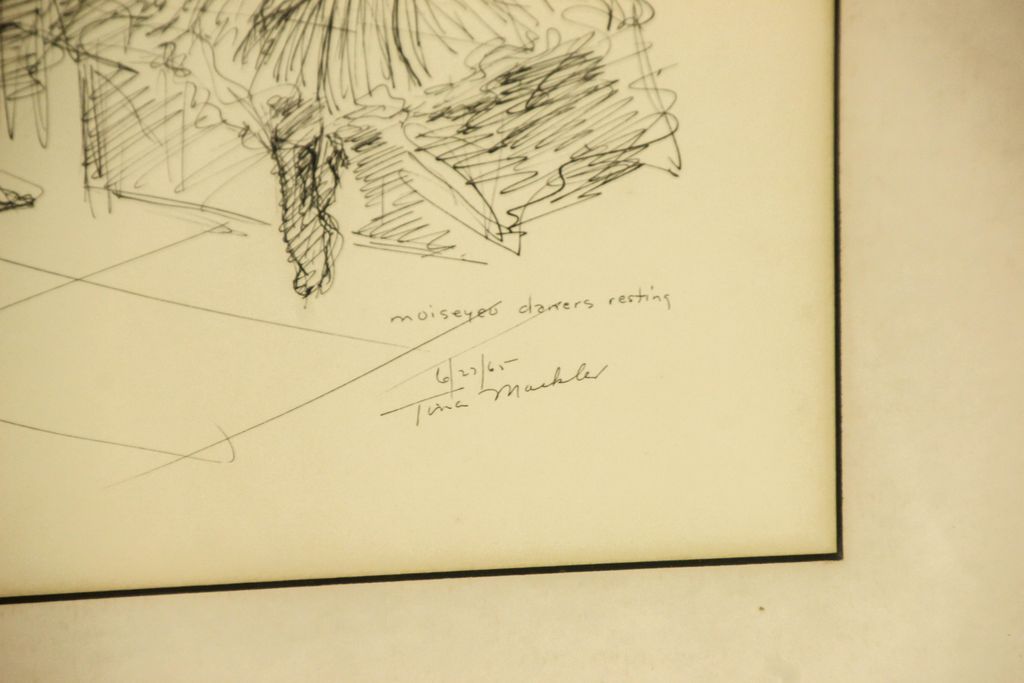 Etching entitled "Moiseyev Dancers Resting", 6/25/65 signed Tina Mackler (born in England) active in New York.; 25" w., 21" h. “Moiseyev Dancers Resting” 6/27/65 - pen & ink drawing Russian folk dance troop (most famous of all folk troops in the world). Etching entitled "Moiseyev Dancers Resting", 6/25/65 signed Tina Mackler (born in England) active in New York.; 25" w., 21" h. “Moiseyev Dancers Resting” 6/27/65 - pen & ink drawing Russian folk dance troop (most famous of all folk troops in the world).