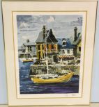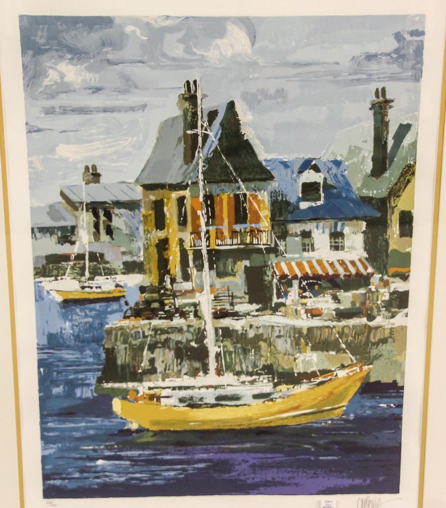 Limited edition serigraph of sailboat and harbor signed by artist 52/300; 34" w., 42 1/2" h. Limited edition serigraph of sailboat and harbor signed by artist 52/300; 34" w., 42 1/2" h.