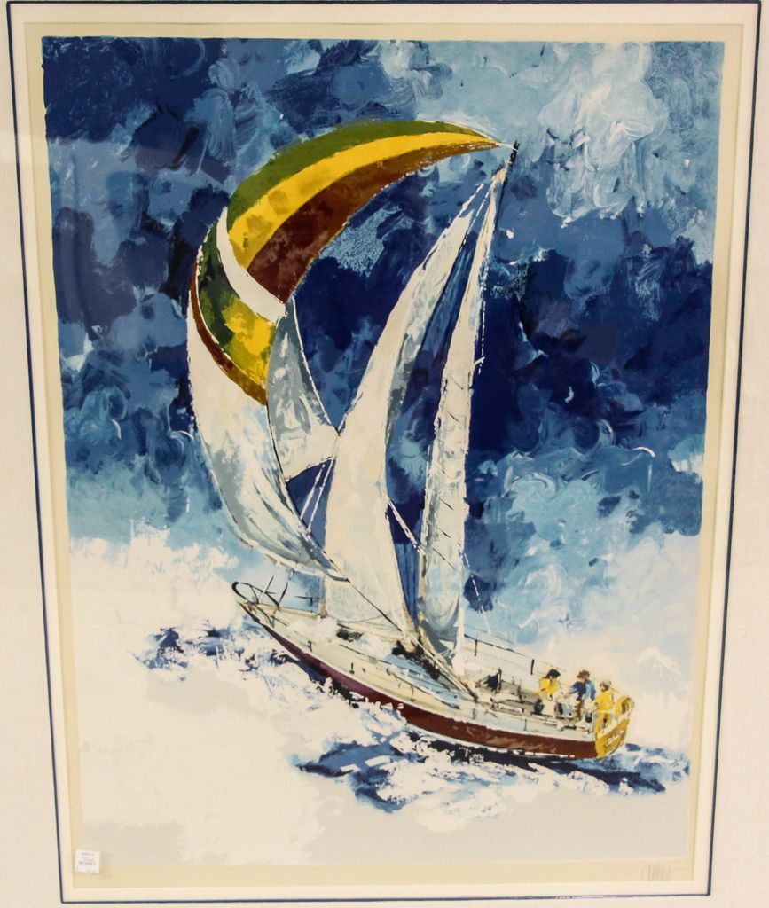 Limited edition serigraph of sailboat signed by artist 131/500; 35 1/2" w., 45" h. Limited edition serigraph of sailboat signed by artist 131/500; 35 1/2" w., 45" h.