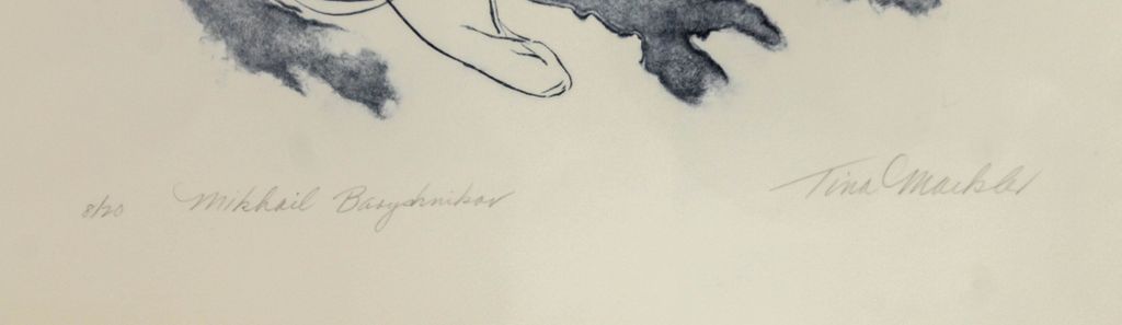 Unframed artist proof entitled "Cry" and 8/20 limited edition of Mikhail Baryshnikov both signed by Tina Mackler; 16" w., 21 1/2" h. “Mikhail Baryshnikov” is Russian dancer from the Kirov Ballet (Leningrad). In 1964 he defected in Canada while the Kirov was on tour. Later he moved to New York, joined NYC Ballet (Balanchine). Also danced with American Ballet Theatre & later became their Artistic Director. He became a US citizen in 1986, was nominated for an Academy Award (Best Supporting Actor) in the film “The Turning Point”. TV had significant role in “Sex and the City”. Unframed artist proof entitled "Cry" and 8/20 limited edition of Mikhail Baryshnikov both signed by Tina Mackler; 16" w., 21 1/2" h. “Mikhail Baryshnikov” is Russian dancer from the Kirov Ballet (Leningrad). In 1964 he defected in Canada while the Kirov was on tour. Later he moved to New York, joined NYC Ballet (Balanchine). Also danced with American Ballet Theatre & later became their Artistic Director. He became a US citizen in 1986, was nominated for an Academy Award (Best Supporting Actor) in the film “The Turning Point”. TV had significant role in “Sex and the City”.