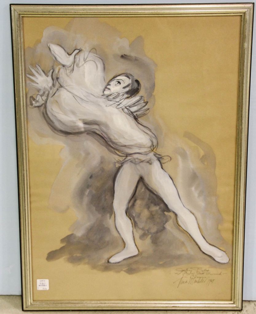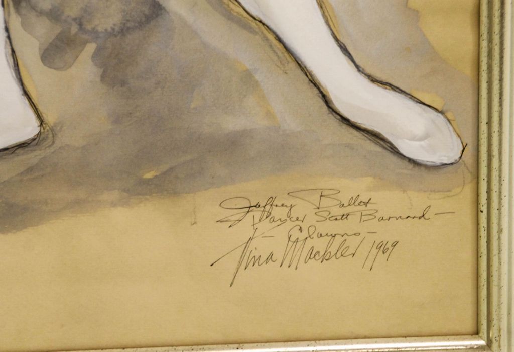 Original watercolor of Joffrey ballet dancer Scott Bernard, "Clowns" signed by Tina Mackler; 20" w., 27" h. “Clowns” Joffrey Ballet – water color. Robert Joffrey was the Chairman of the Jury for the USA IBC (1979, 1982, 1986). Throughout her career Tina focused mainly on the idea of capturing performers in movement, circus performers, race horses, mime artist Marcel Marceau and dancers. Dancers all over the world knew Tina and loved her drawings as she captured them in “flight” while viewing them from the wings or during rehearsals. The SMITHSONIAN MUSEUM, Washington DC has 2 works by Tina Mackler in their collection. She also collaborated with THALIA MARA on several of her books, “STEPS IN BALLET” books and “TO DANCE TO LIVE”. Original watercolor of Joffrey ballet dancer Scott Bernard, "Clowns" signed by Tina Mackler; 20" w., 27" h. “Clowns” Joffrey Ballet – water color. Robert Joffrey was the Chairman of the Jury for the USA IBC (1979, 1982, 1986). Throughout her career Tina focused mainly on the idea of capturing performers in movement, circus performers, race horses, mime artist Marcel Marceau and dancers. Dancers all over the world knew Tina and loved her drawings as she captured them in “flight” while viewing them from the wings or during rehearsals. The SMITHSONIAN MUSEUM, Washington DC has 2 works by Tina Mackler in their collection. She also collaborated with THALIA MARA on several of her books, “STEPS IN BALLET” books and “TO DANCE TO LIVE”.