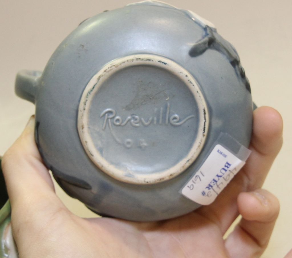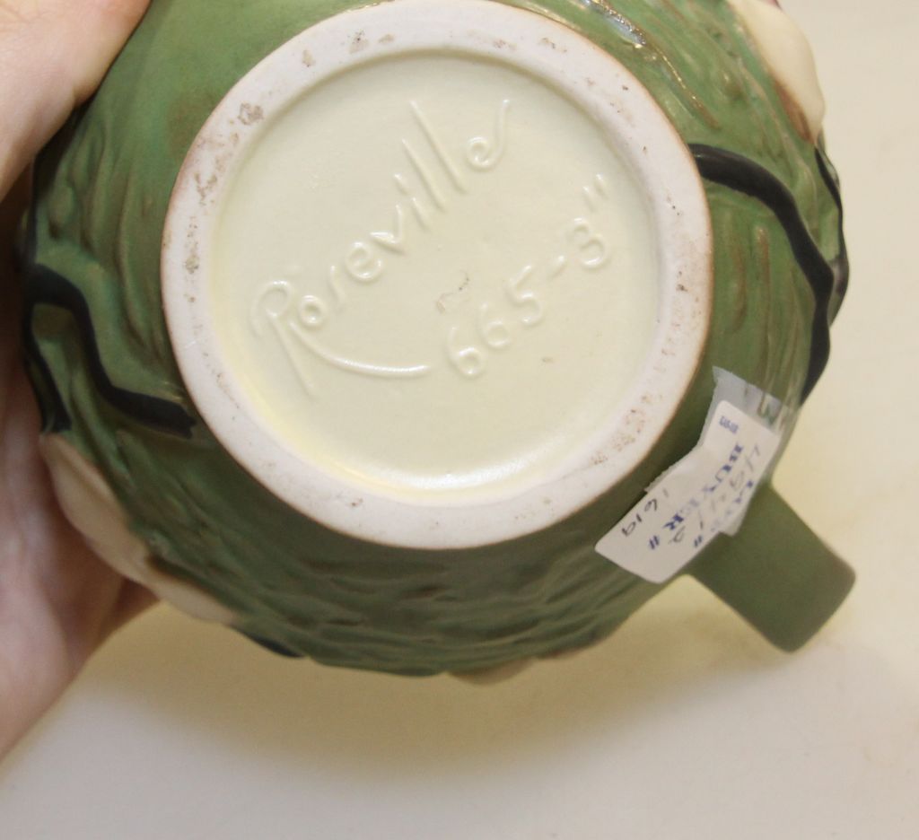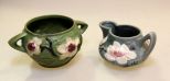 Roseville 665-3 two handled green vase 6" dia., 3 1/2" h. and Roseville grey magnolia pitcher 5" dia., 4 1/2" h. Roseville 665-3 two handled green vase 6" dia., 3 1/2" h. and Roseville grey magnolia pitcher 5" dia., 4 1/2" h.