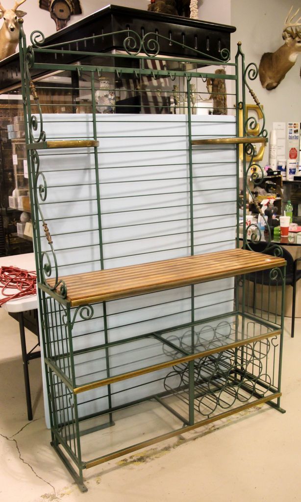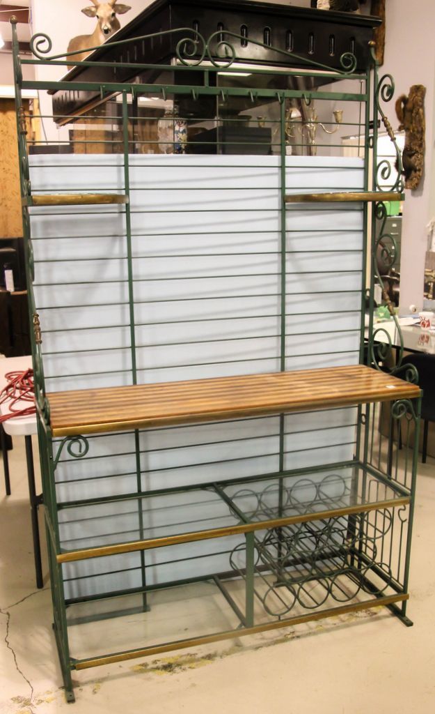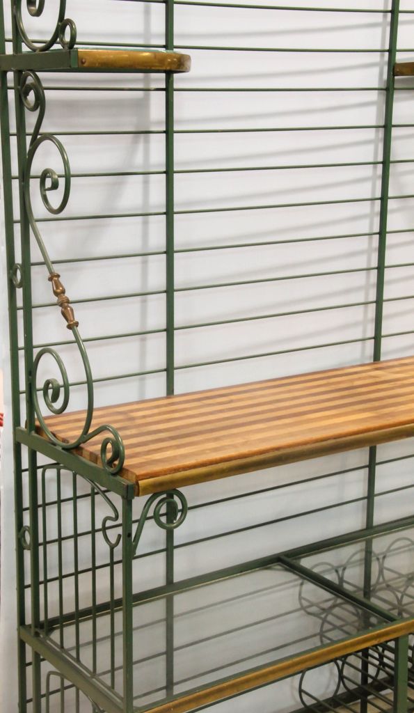 Large iron bakers rack with chopping block top, glass shelves, pot hangers and wine rack.; 48 1/2" w., 15 1/2" d., 82" h. Large iron bakers rack with chopping block top, glass shelves, pot hangers and wine rack.; 48 1/2" w., 15 1/2" d., 82" h.