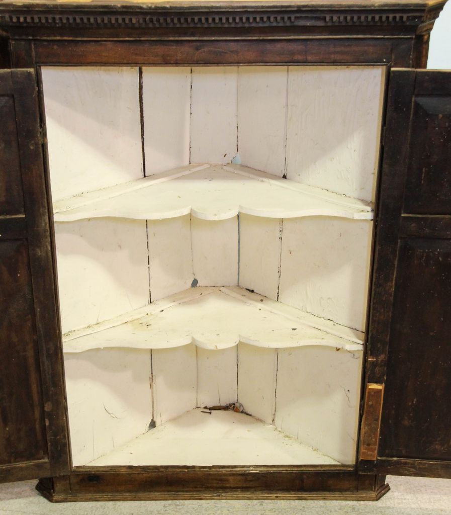 19th century two door hanging cabinet with dentil molding and painted interior shelves; 35" w., 16 1/2" d., 45" h. 19th century two door hanging cabinet with dentil molding and painted interior shelves; 35" w., 16 1/2" d., 45" h.