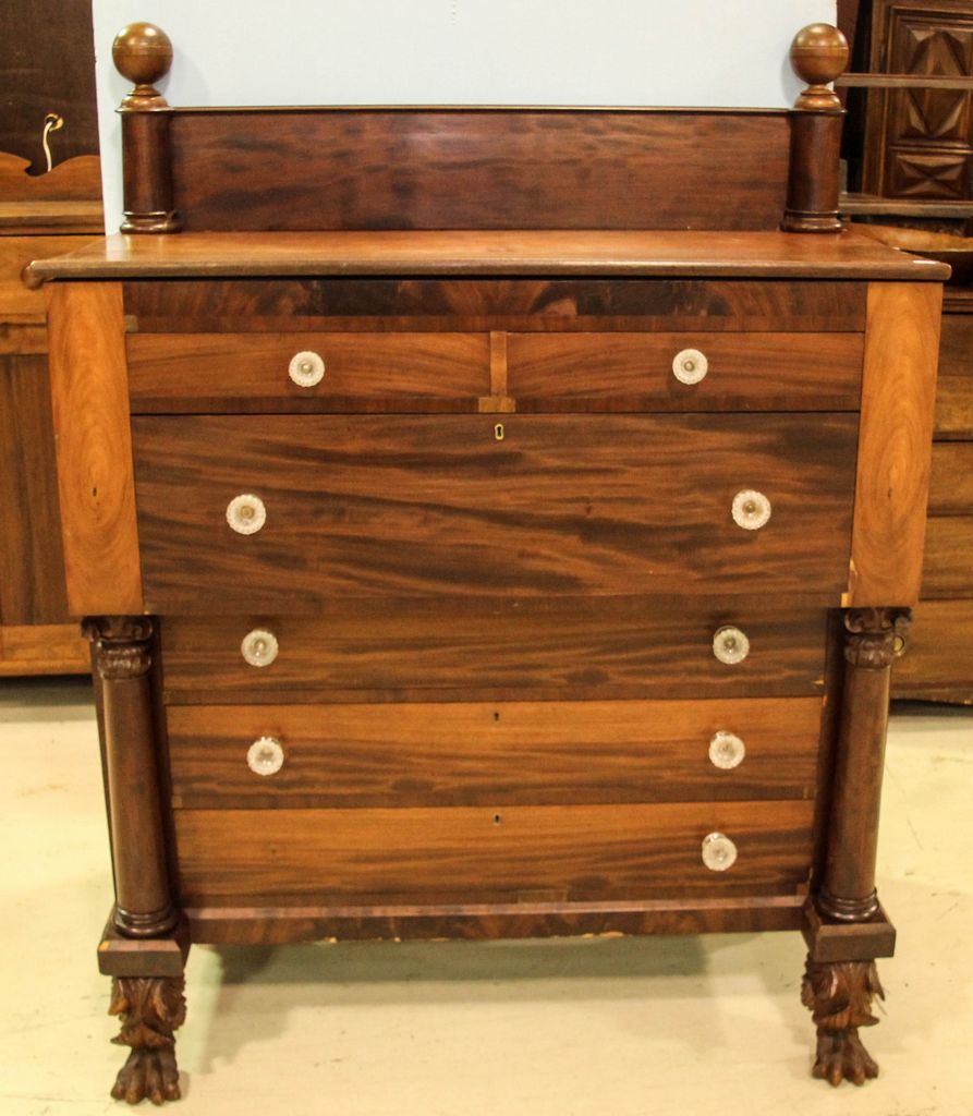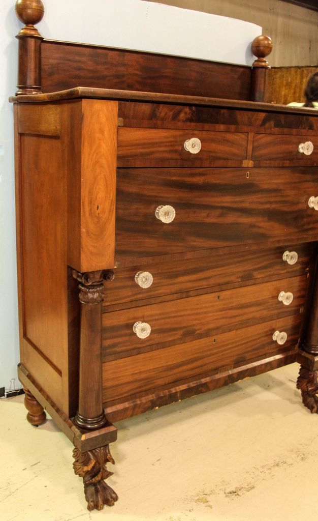 1840 empire mahogany chest with glass knobs, columns and carved paw feet.; 48 1/2" w., 22 1/2" d., 64" h. 1840 empire mahogany chest with glass knobs, columns and carved paw feet.; 48 1/2" w., 22 1/2" d., 64" h.