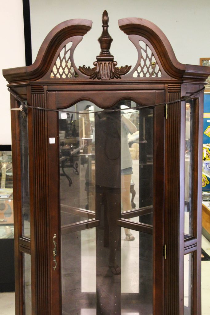 Lighted glass broken pediment top display corner cabinet.; 36" w., 29" d. Lighted glass broken pediment top display corner cabinet.; 36" w., 29" d.