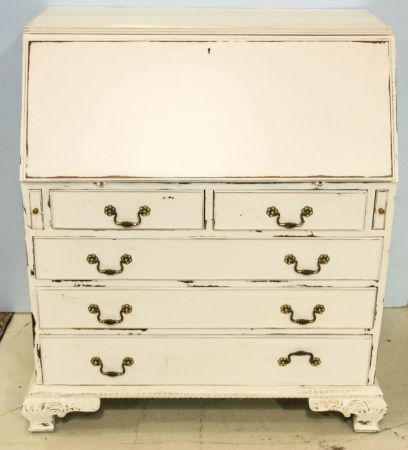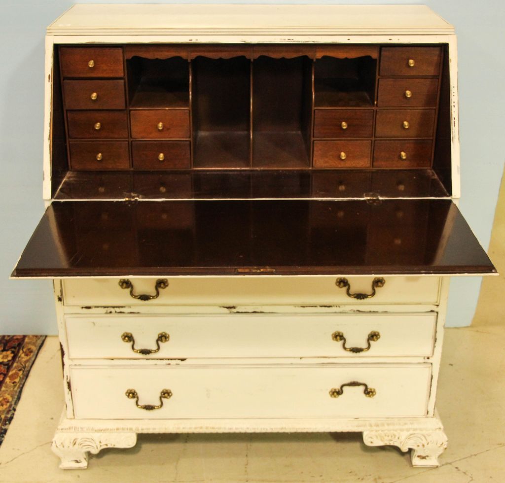 Hand painted white bracket foot drop front desk.; 37" w., 44" h., 21" d. Hand painted white bracket foot drop front desk.; 37" w., 44" h., 21" d.