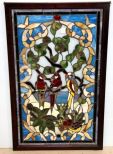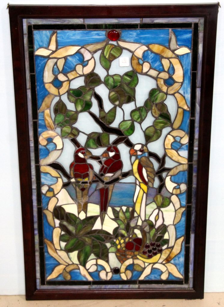 Parrot stained glass beveled window in frame.; 22" w., 36" h. Parrot stained glass beveled window in frame.; 22" w., 36" h.
