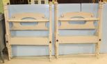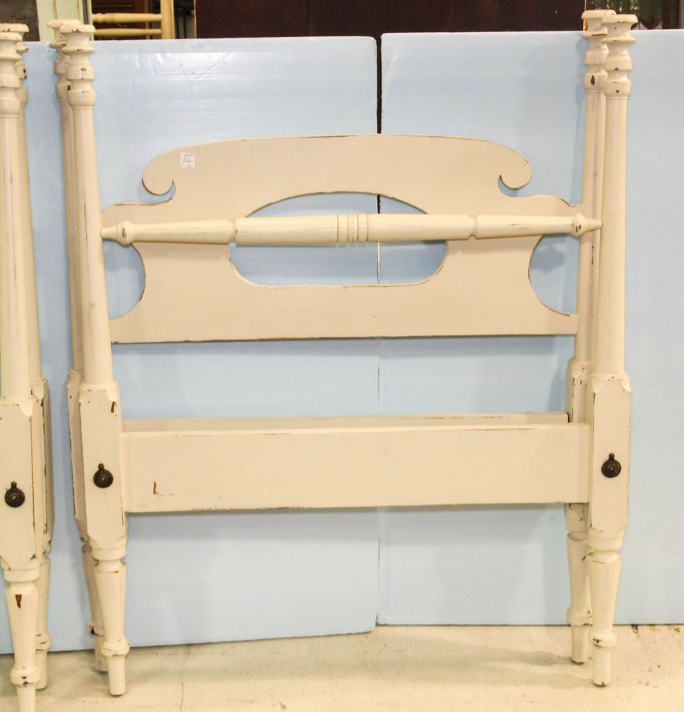 Pair of early hand painted white poster twin beds with bolt in rails.; 51" h. Pair of early hand painted white poster twin beds with bolt in rails.; 51" h.