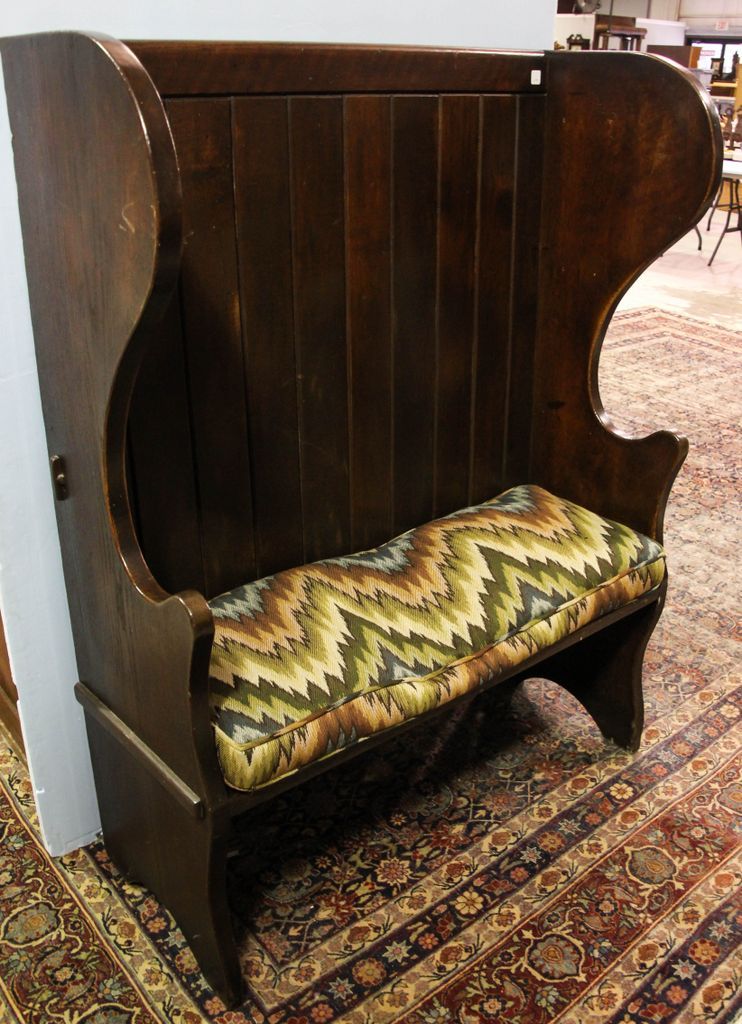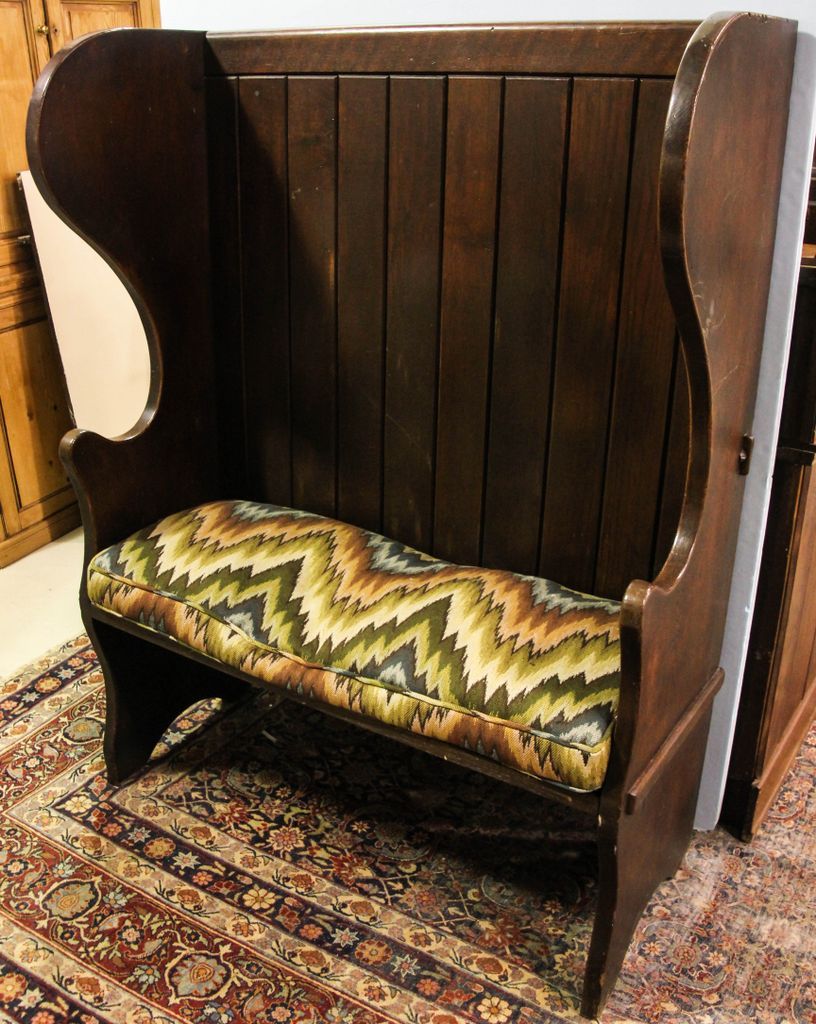 Tavern of hall seat with wide tongue and groove back; 43" w., 17 1/2" d., 57" h. Tavern of hall seat with wide tongue and groove back; 43" w., 17 1/2" d., 57" h.