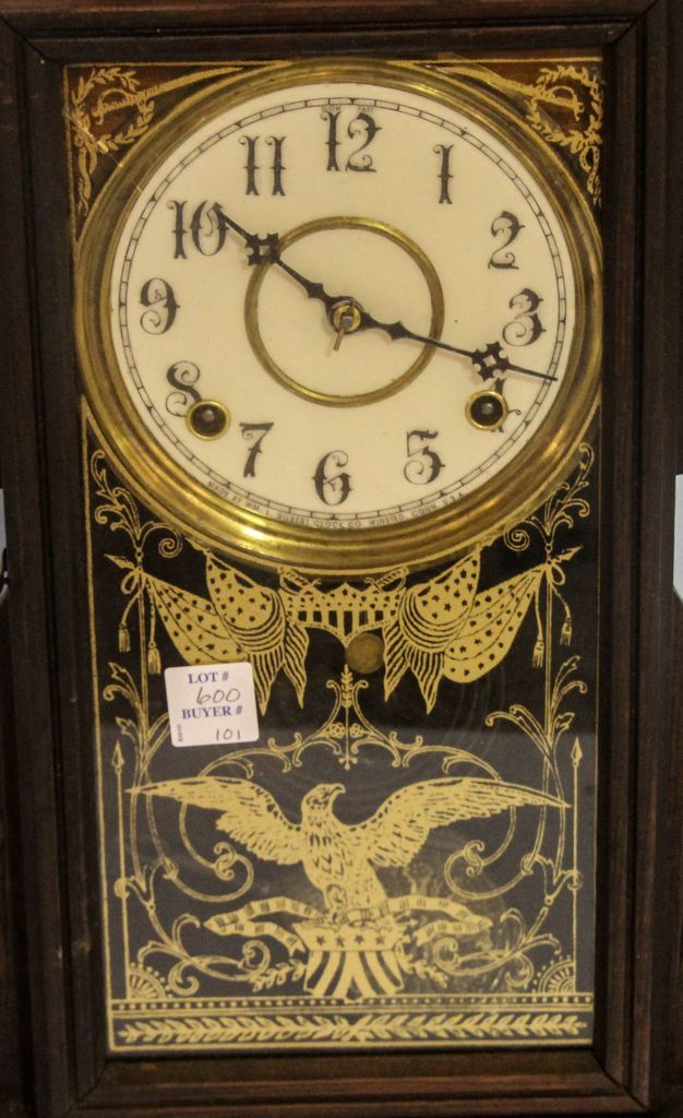 Carved oak and mantel clock with porcelain dial, gold etched eagle, and has key; 13 1/2" w., 22": h. Carved oak and mantel clock with porcelain dial, gold etched eagle, and has key; 13 1/2" w., 22": h.