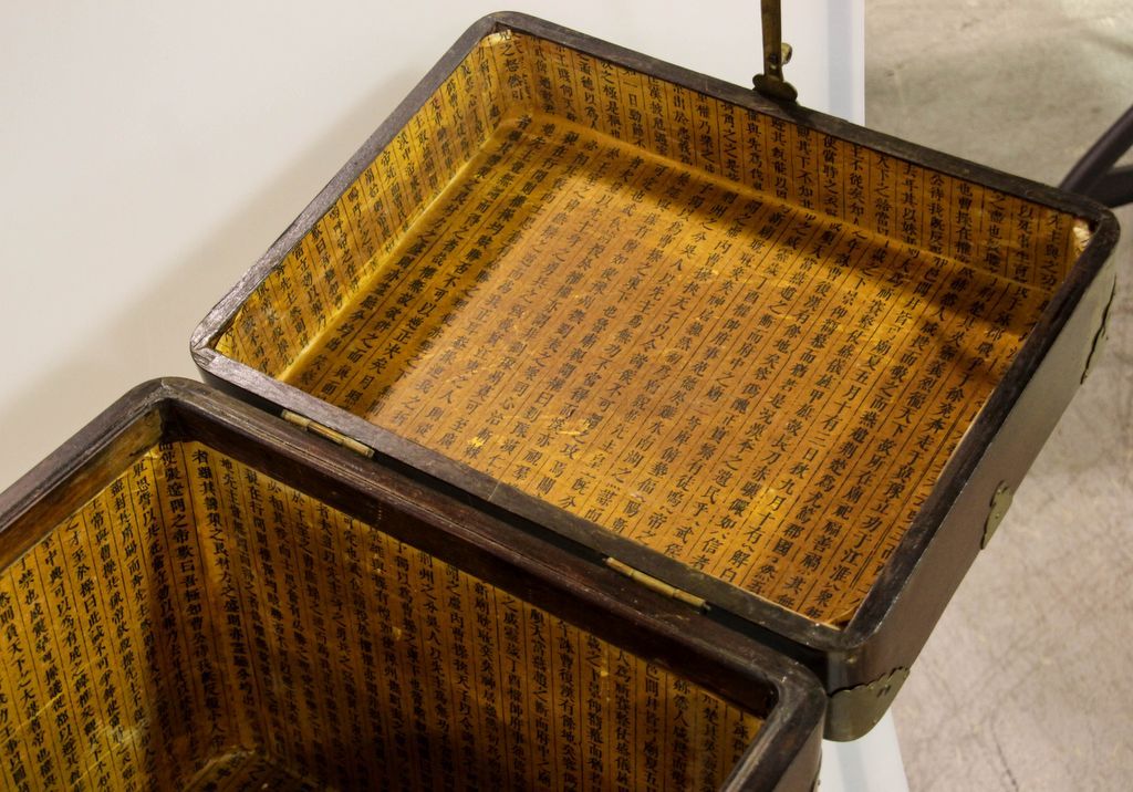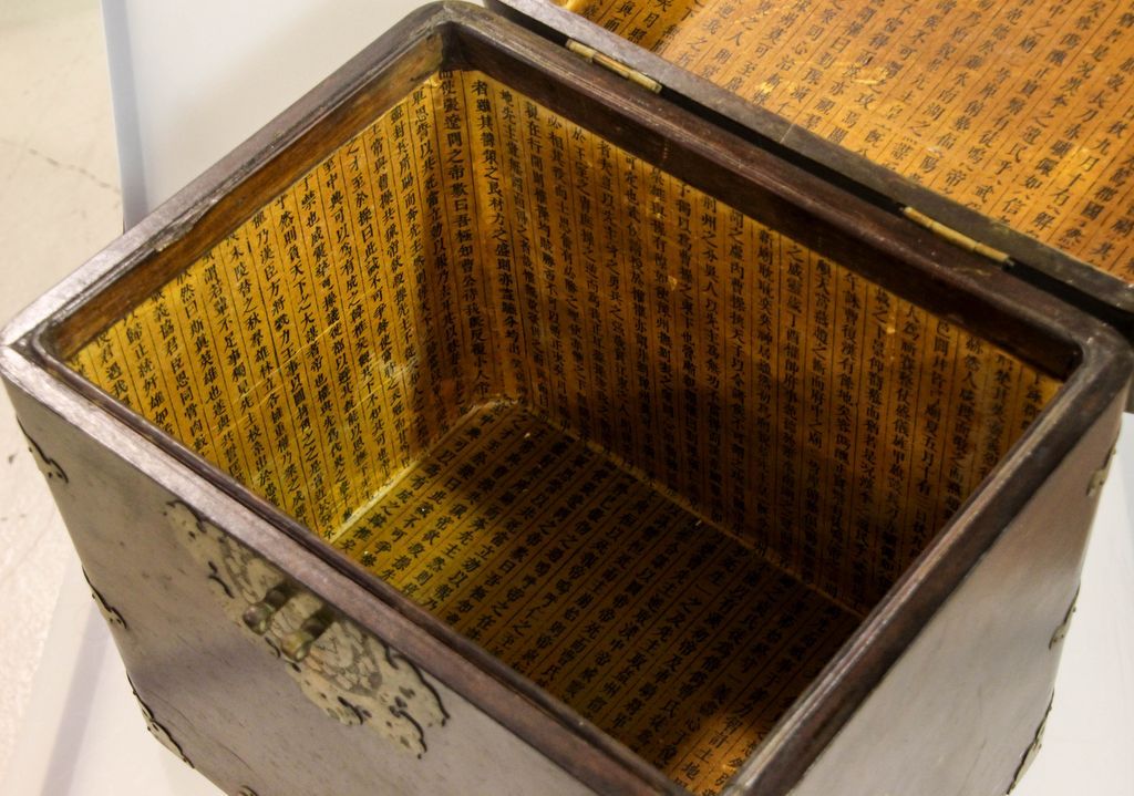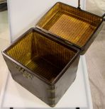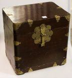 Antique large Chinese wine box with ornate brass hinges and straps.; 15" w., 11" d., 14 1/2" h. Antique large Chinese wine box with ornate brass hinges and straps.; 15" w., 11" d., 14 1/2" h.