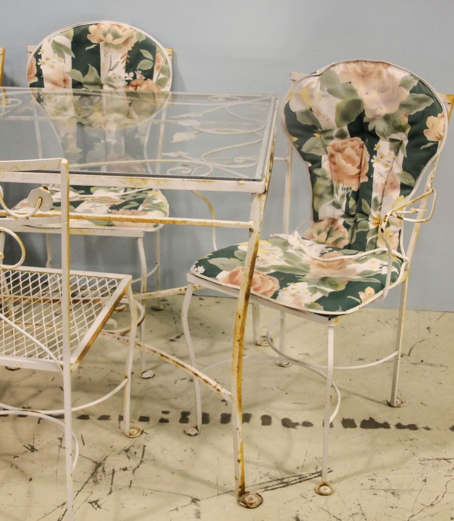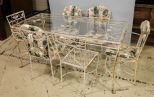 Wrought iron table and six matching wrought iron chairs Wrought iron table and six matching wrought iron chairs