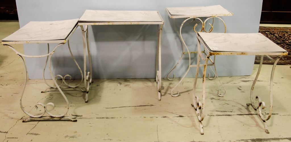 Set of four wrought iron side tables.; 17" h. & 19" h. Set of four wrought iron side tables.; 17" h. & 19" h.