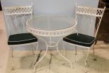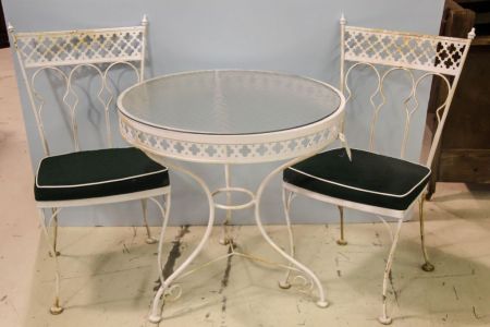 Pair of wrought iron bistro chairs and tempered glass top bistro table.; Chairs- 38" h.; Table- 30" dia., 30" h. Pair of wrought iron bistro chairs and tempered glass top bistro table.; Chairs- 38" h.; Table- 30" dia., 30" h.