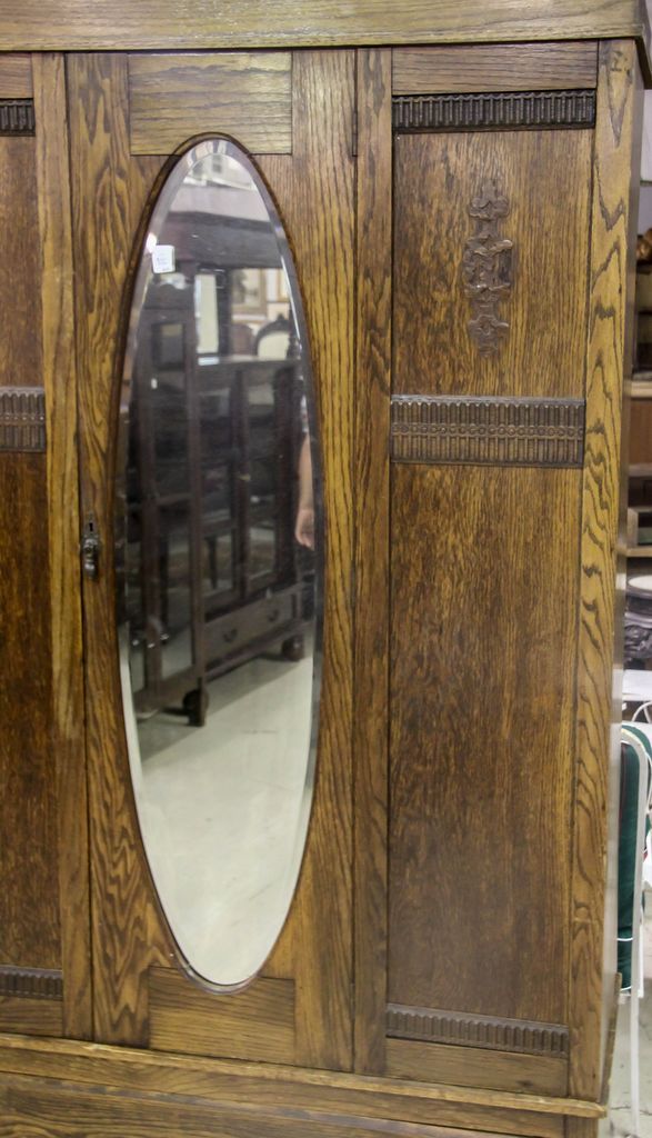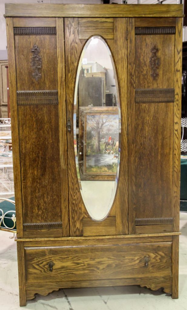 English oak single door armoire with oval beveled glass mirror.; 42 1/2" w., 16" d., 76" h. English oak single door armoire with oval beveled glass mirror.; 42 1/2" w., 16" d., 76" h.