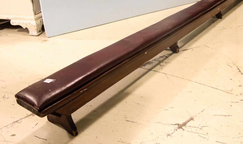 Long leather top church kneeling bench; 9' 4" w., 6" d., 8" h. Long leather top church kneeling bench; 9' 4" w., 6" d., 8" h.