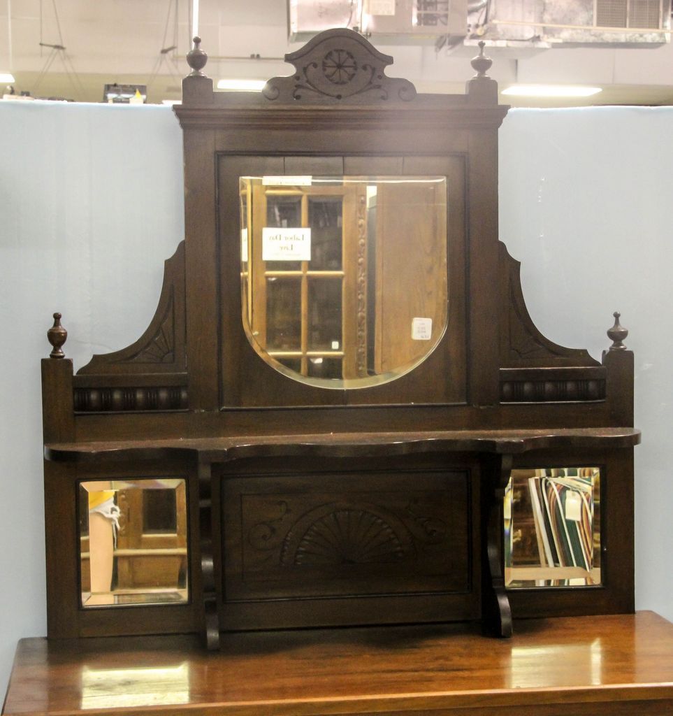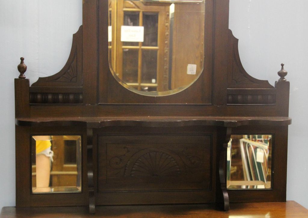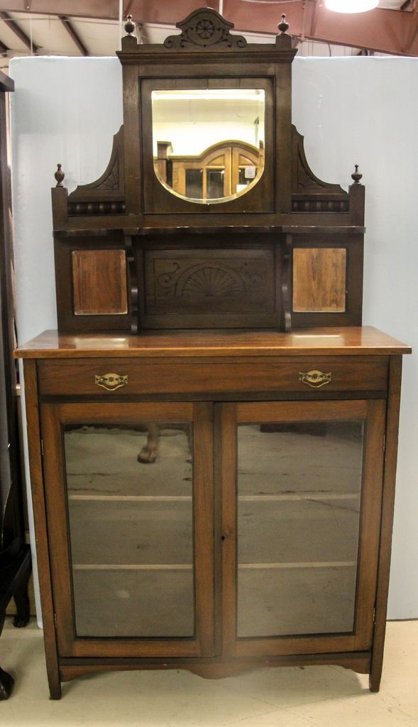 Late 19th century walnut English etagere with beveled glass mirrors. Lower section has two glass doors and interior shelves.; 36" w., 14 1/2" d., 67" h. Late 19th century walnut English etagere with beveled glass mirrors. Lower section has two glass doors and interior shelves.; 36" w., 14 1/2" d., 67" h.