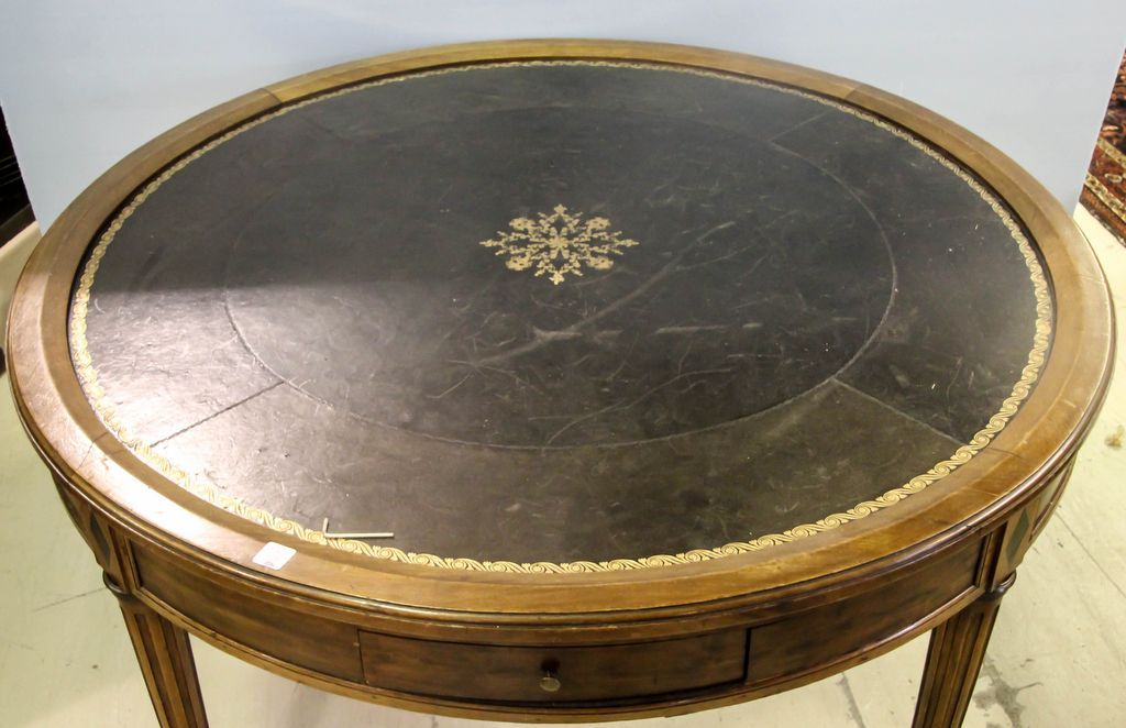 19th century French game table by Krieger with inset leather top with embossed gold band and center medallion, two drawers and two slide outs.; 45" dia., 29" h. 19th century French game table by Krieger with inset leather top with embossed gold band and center medallion, two drawers and two slide outs.; 45" dia., 29" h.