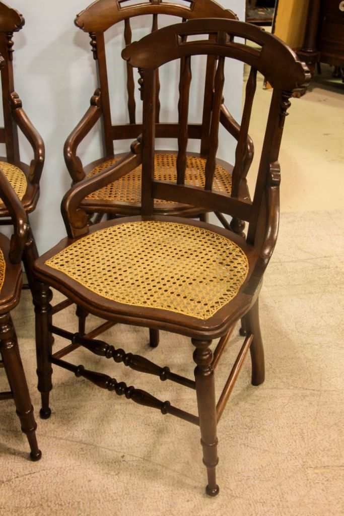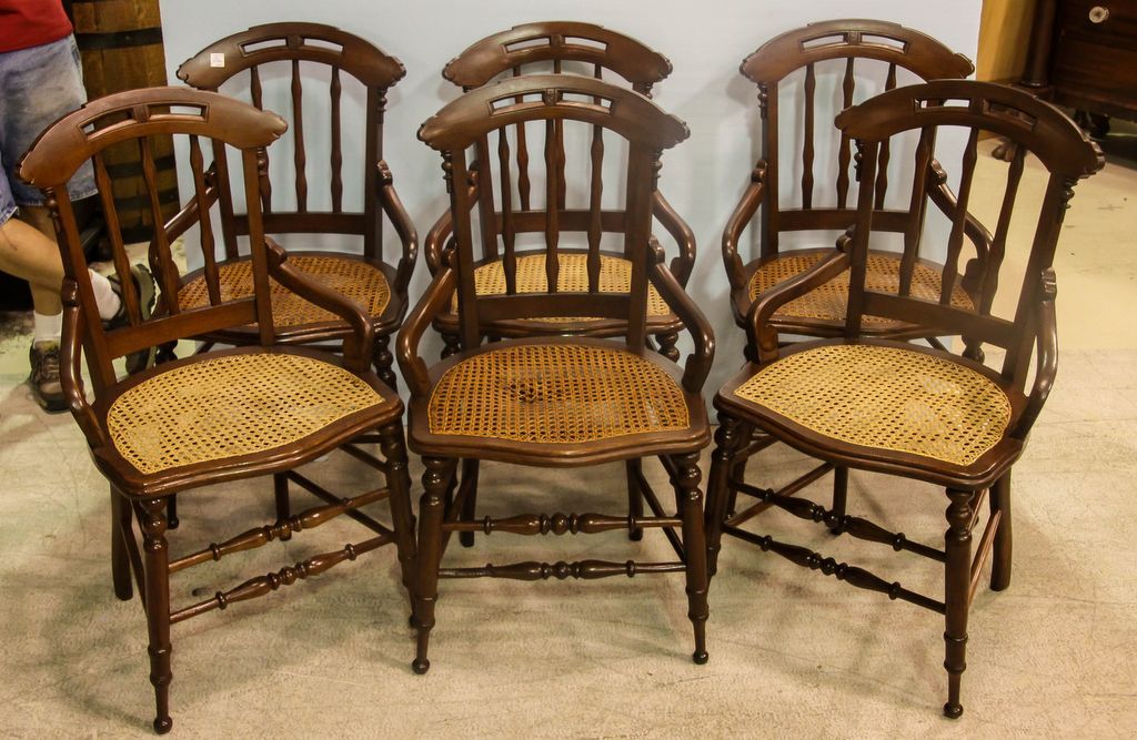 Set of six walnut Victorian cane seat hip hugger chairs.; 36" h. Set of six walnut Victorian cane seat hip hugger chairs.; 36" h.