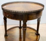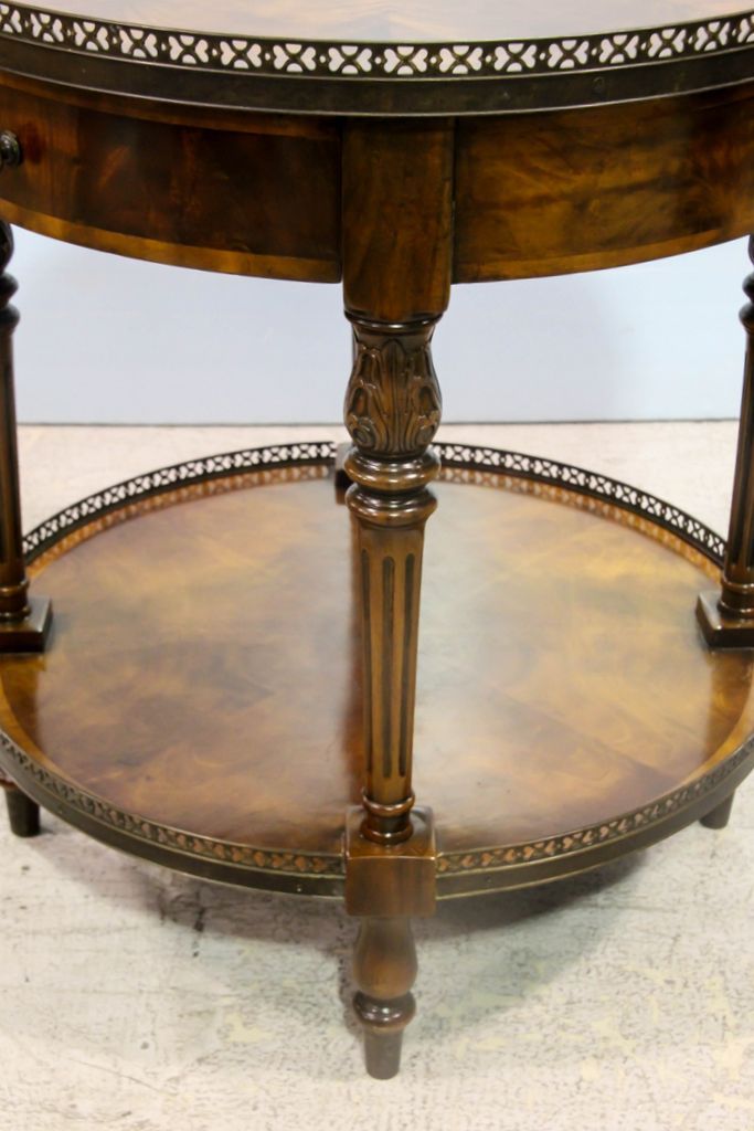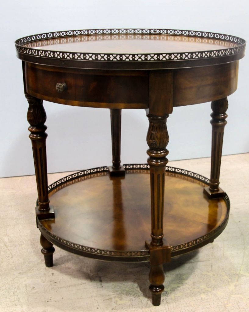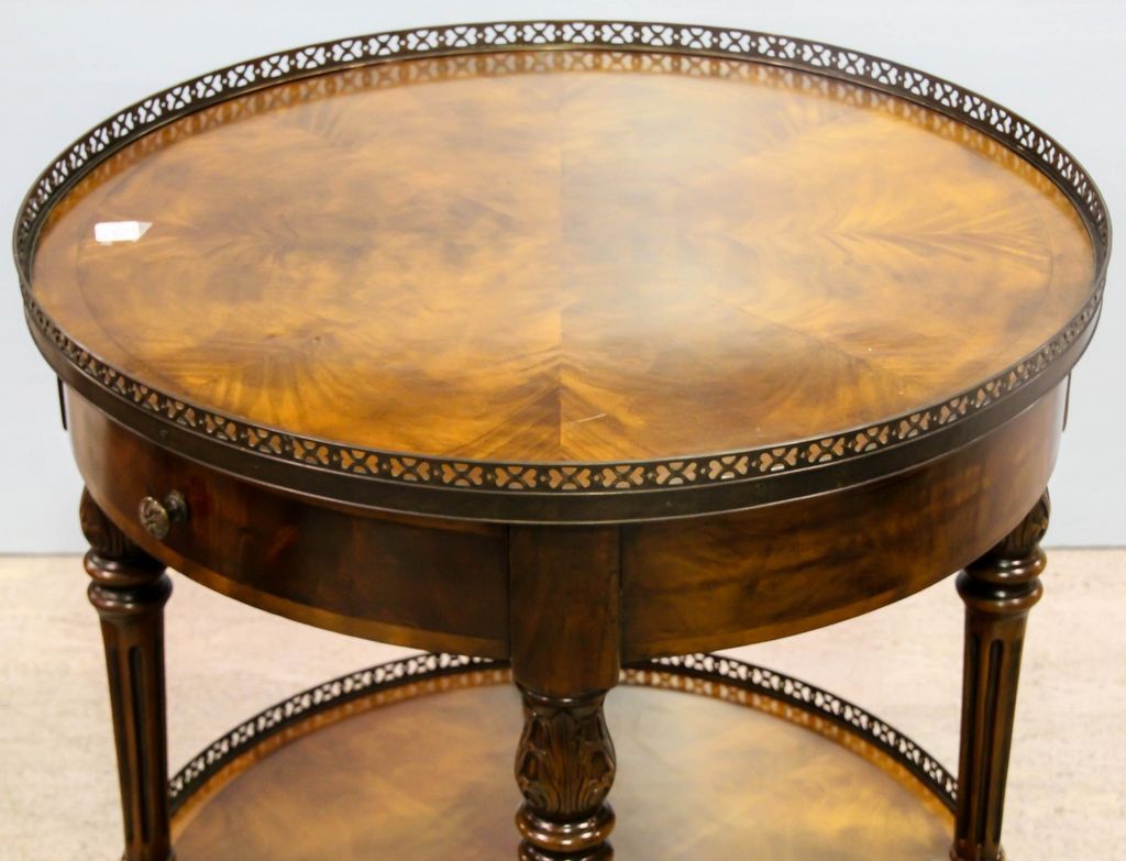 Regency style table with beautiful shaped veneer in the top, brass gallery and lower shelf.; 26 1/2" dia., 29" h. Regency style table with beautiful shaped veneer in the top, brass gallery and lower shelf.; 26 1/2" dia., 29" h.