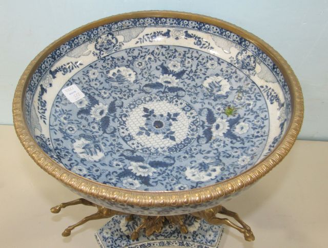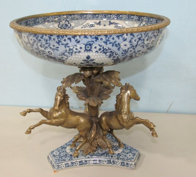 Modern, Brass horse figures, with brass trim, blue and white ceramic bowl and base, crown mark, 14"h., 14"dia. Modern, Brass horse figures, with brass trim, blue and white ceramic bowl and base, crown mark, 14"h., 14"dia.